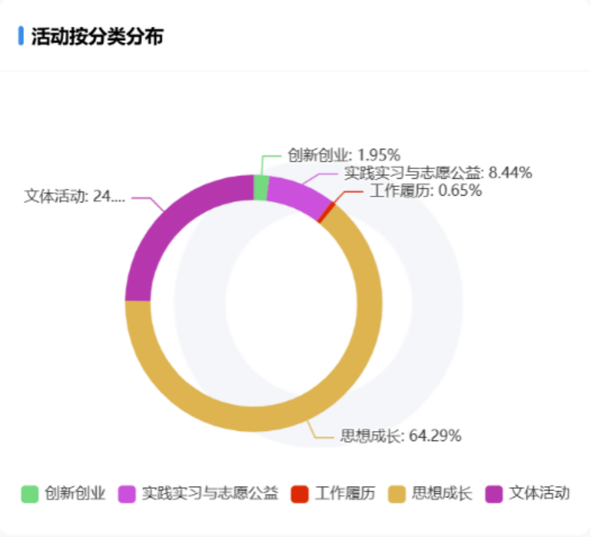 本周聚焦: 签到率 活动数量 活动参与人次 综合评价评分 活动分布: 活动分类分布 院系分布 活动回顾:“模拟就业 职引未来”大学生求职技能提升活动“AI赋能·智启未来”大学生AI数字工匠培育计划传承雷锋精神,弘扬榜样力量”第二课堂系列公益讲座活动