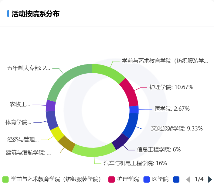 各院系发布的活动数量占比,数量较多的学院依次有五年制大专部、汽车与机电工程学院和学前与艺术教育学院。