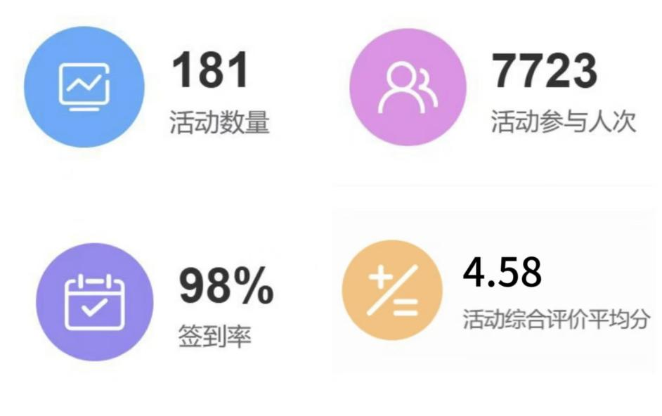 我校第二课堂本周活动量为181,活动参与人数为7723,活动的签到率达到98%,几乎全员参与,活动综合评价的平均分为4.58。
