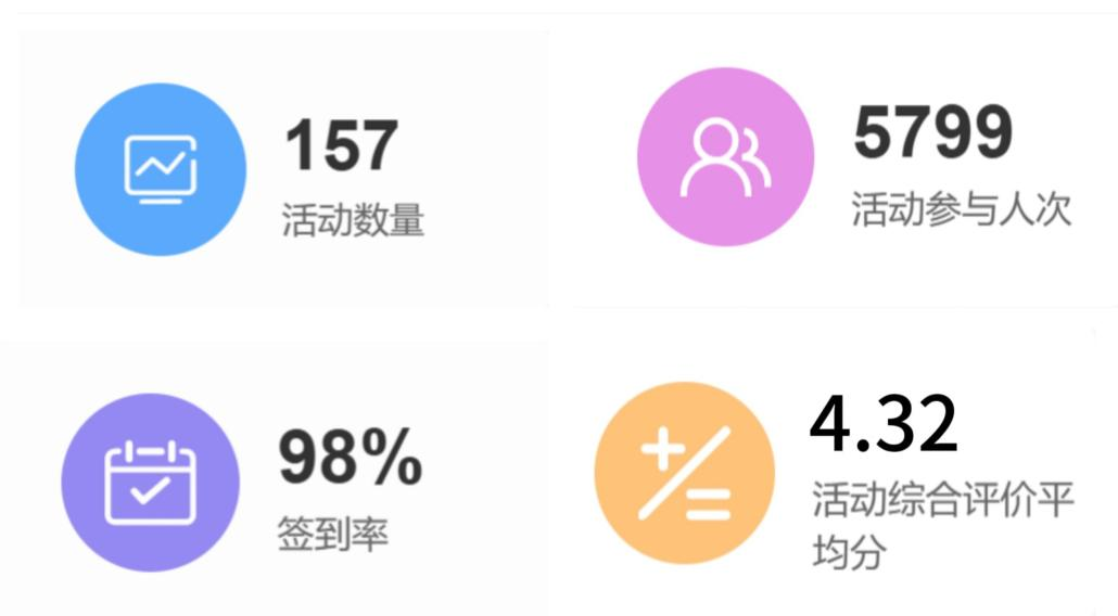 我校第二课堂本周活动量为157,活动参与人数为5799,活动的签到率达到98%,几乎全员参与,活动综合评价的平均分为4.32。