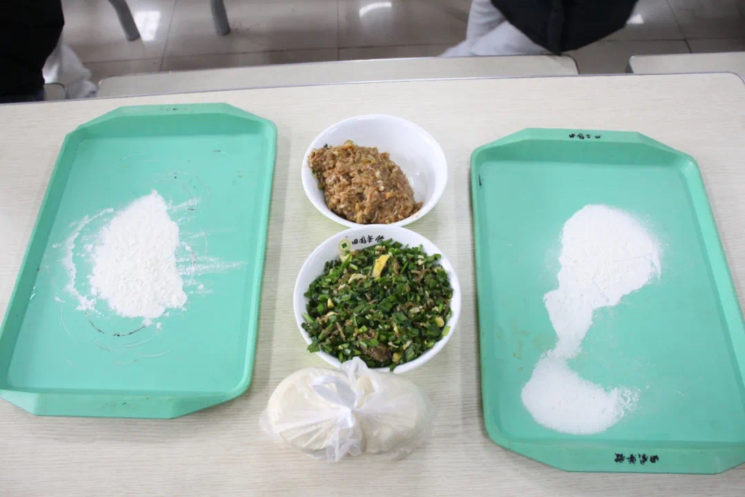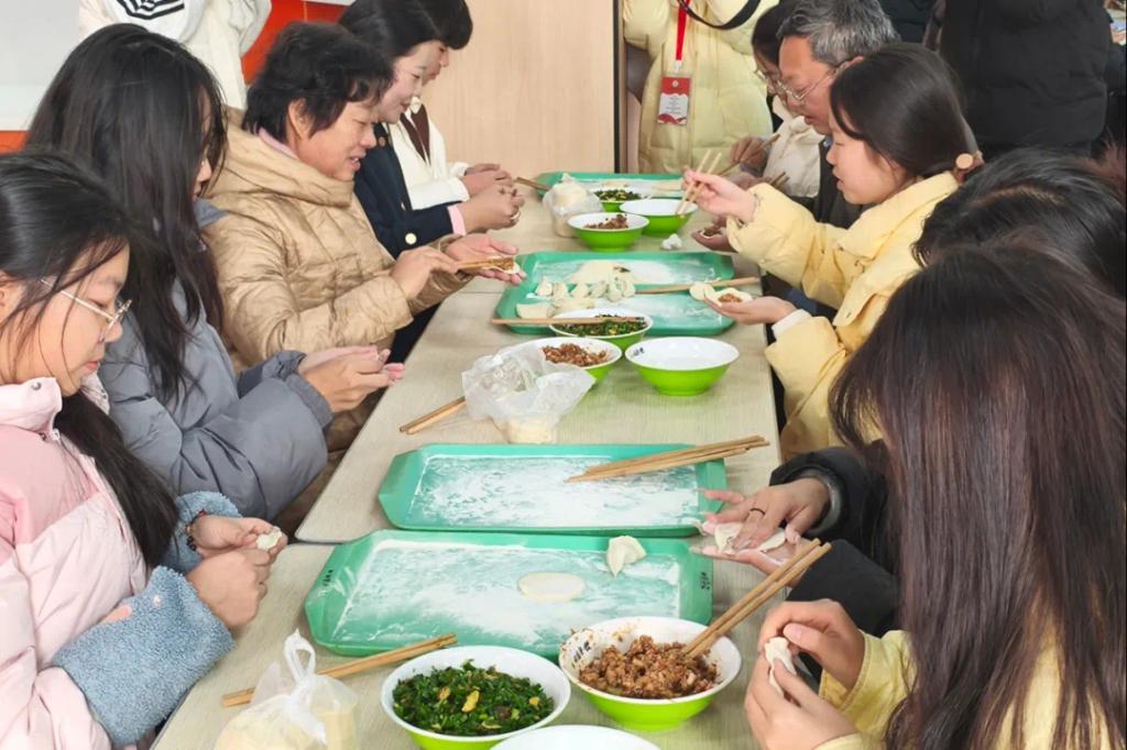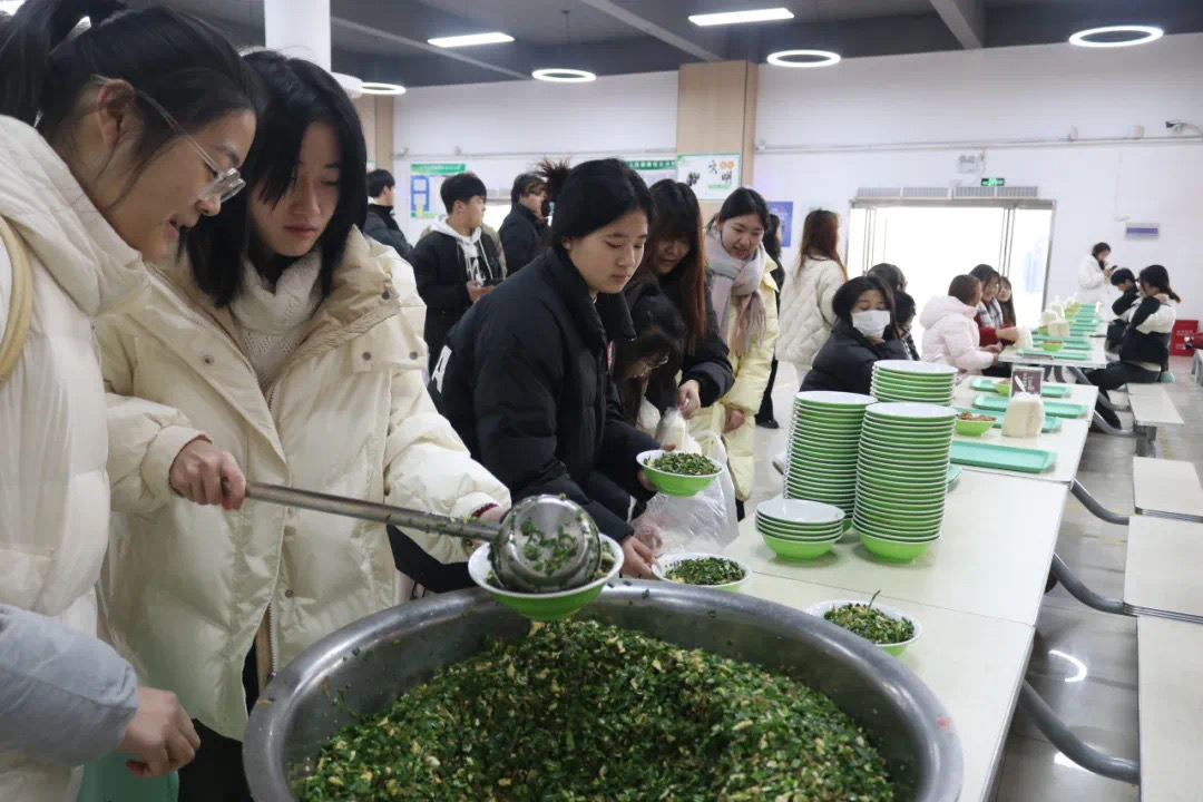 活动现场,同学们围在桌子边一起包饺子。有的同学手法娴熟,只见他们手指灵活地摆弄着饺子皮和馅料,不一会儿,一个个精致的饺子就整齐地排列在托盘上。而有的同学手法略显生硬,小心翼翼地放着馅料,努力地把饺子皮捏合在一起,虽形状各异,但也充满了俏皮的模样。大家一边包饺子一边唠家常,现场笑语连连,温暖而又和谐。
