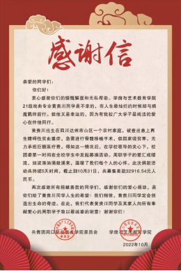 截至目前,各院部团总支的捐款合计32916.54元,善款将由学前与艺术教育学院转交给黄贵川同学的家人。