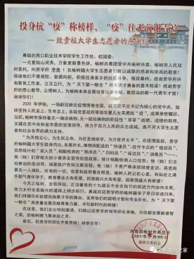共青团榆树市委员会在感谢信中说到:榆树共青团受中共榆树市委、榆树市人民政府委托,向贵学府李奥1名榆树籍大学生志愿者们致以诚挚的感谢和崇高的敬意!感谢他不畏艰险、奋勇向前,积极投身家乡的抗疫斗争,报效桑梓;感谢贵学府所有教育工作者,立言立行,为“天下第一粮仓”培育德才兼备的嘉木栋梁!感谢贵学府的悉心教导,立德树人,为榆树未来发展培育出讲奉献、敢担当的新一代青年才俊!谢谢你们!