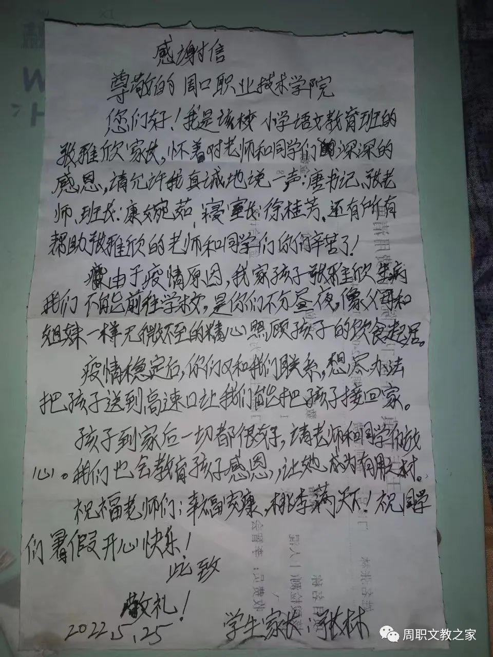 学生生病期间,领导和老师们一句句关爱的话语,一次次暖心的护送,点点滴滴如同阳光温暖了学生家长内心深处最柔软的地方。家长张林在见到张文华老师的那刻已泣不成声,握着张老师的手一遍遍道谢。不久,一封感谢信不期而至,感谢信中,张林一笔一画用心书写着对周口职业技术学院的感谢,对文化教育学院的感谢,他说:“想不到用什么来表达感激之情,我将全部的感激融入到了这封信中,愿这封信能代表我谢谢学校,谢谢老师!”