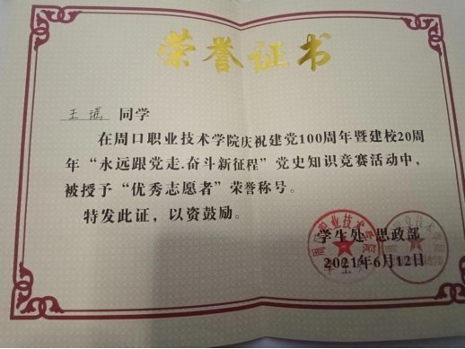 8.2021年6月党史知识竞赛活动中荣获校级“优秀志愿者”