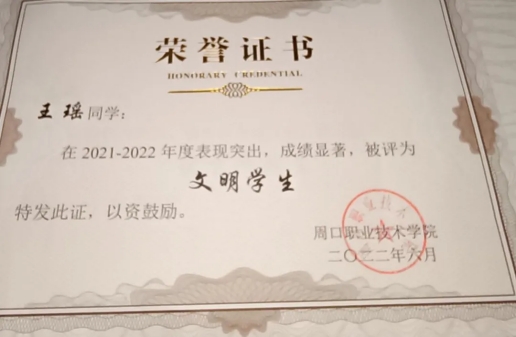 班级上,任劳任怨,工作努力。该生热情洋溢为集体服务,是老师的得力助手,是老师与同学们之间的桥梁。积极主动组织同学们参加学校组织的各项活动。被评为院级“优秀学生干部”。在2021年五四表彰中,被评为“优秀学生干部”