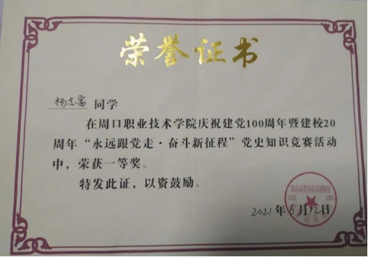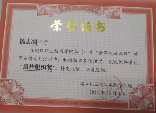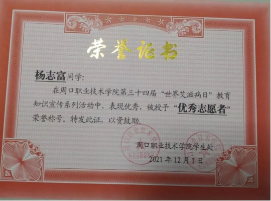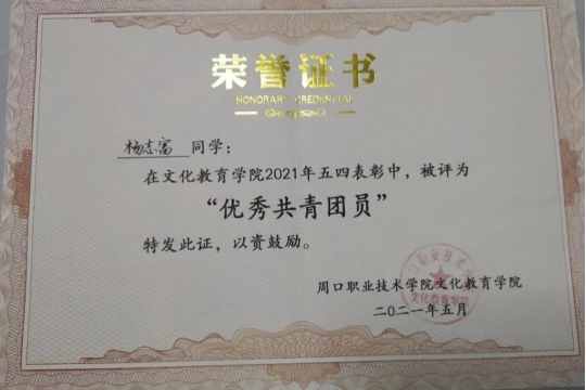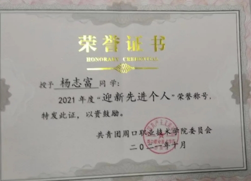 杨志富,男,周口职业技术学院,文化教育学院,20级语文教育专业7班团支书兼副班长,院团总支宣传部部长,在校期间荣获“文化教育学院优秀团员”“2021年度魅力团支书”,“文明学生”“三好学生”“周口职业技术学院20级优秀毕业生”“优秀学生干部”“国家励志奖学金”。大一时加入团总支,大二时担任宣传部部长,对党、团组织有了更深刻的认识与感悟,对团务工作也有了更加深刻的了解与认识。2021年中国共产党建党百年之际配合团总支、部长完成了征文写作比赛,并在学院和老师的指导下,参加了“中国共产党建党百年党史知识竞赛”荣获校级一等奖;在2021年周口职业技术学院第五届学生职业技能大赛师范生教学技能比赛中荣获二等奖;在周口职业技术学院第34届“世界艾滋病日”教育宣传系列活动中,积极组织各项活动,表现优异荣获最佳组织奖”,“优秀志愿者”。在2022年迎新活动中,积极奉献,积极参与,荣获“迎新先进个人”称号。2023年,考入商丘学院。
