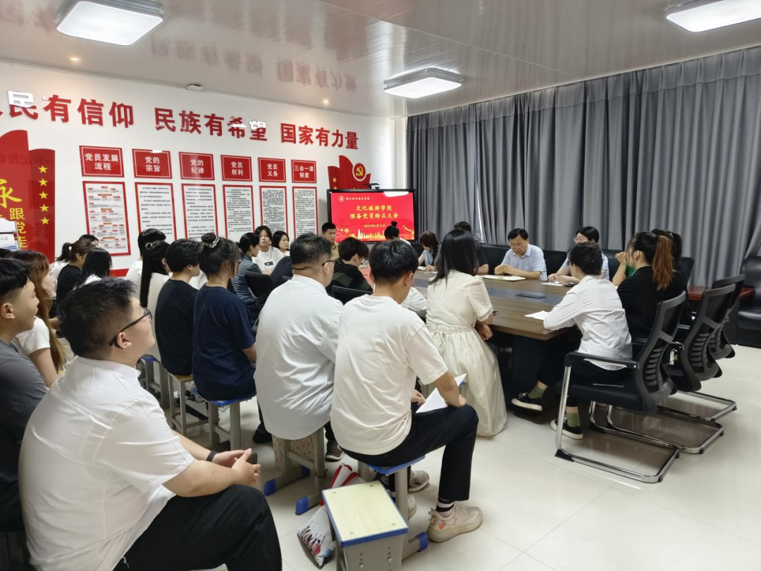 为加强基层党组织建设,规范做好发展党员工作,培养优秀党员,6月14日上午,文化旅游学院在五区党员活动室召开预备党员转正大会,讨论预备党员桑肖婷、徐行行等27名同志转正问题。学院党总支书记展贤东、学生支部书记普俊、学生支部全体党员、各位学生入党考察培养人参加会议。会议由学生支部书记普俊主持。