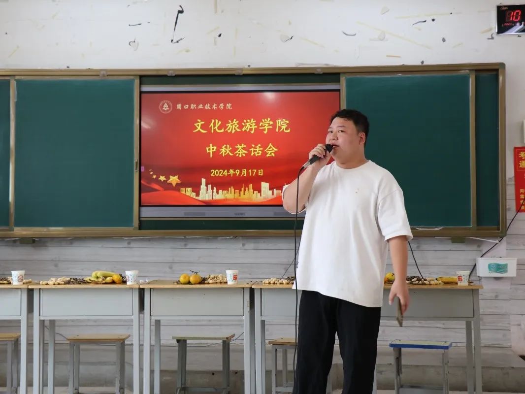 首先,我院党总支书记展贤东代表学院为同学们送上中秋节的美好祝福,希望来自不同省份的学生在文旅学院感受到家的温暖,在此次活动中收获开心与幸福。他鼓励同学们要培养自身德、智、体、美、劳等全面发展,积极锻炼身体不熬夜,通过参加课外活动和日常劳动提升美育和劳育能力;要勇于发挥自身优势,积极参与学校的实践活动,以干促学,明确个人的兴趣和激情所在,设定好目标基础,不断扩展自己的知识和技能,为国家发展和民族团结贡献自己的力量。