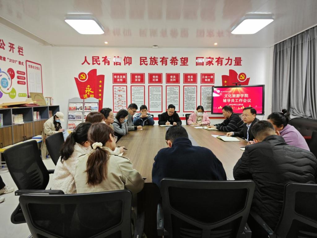 11月9日下午,文化旅游学院在五区党员活动室召开安全稳定工作专题会议,传达贯彻落实学校安全工作会议精神,安排部署学院安全稳定工作。党总支书记展贤东,副院长于慧娟、李炯,学管办主任普俊、综合办主任石永丽以及23级、24级全体辅导员参加会议。会议由展贤东主持。