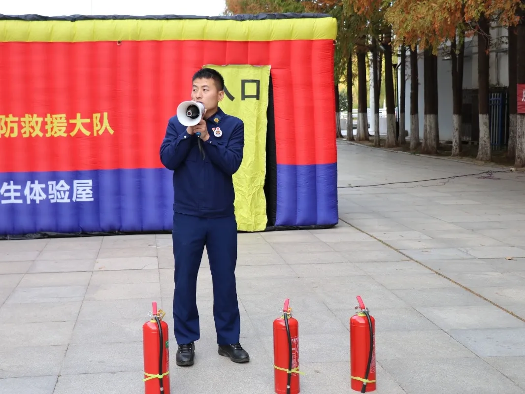 随后,周口市消防支队带领同学们正确使用消防栓,模拟灭火和疏散演练。演练过程中同学们积极参与,认真听取负责人的指导,并按照正确的步骤使用灭火器进行灭火操作。同时,在模拟火灾疏散环节,同学们也能够迅速、有序地撤离到安全区域。整个演练过程紧张而有序,达到了预期的效果。