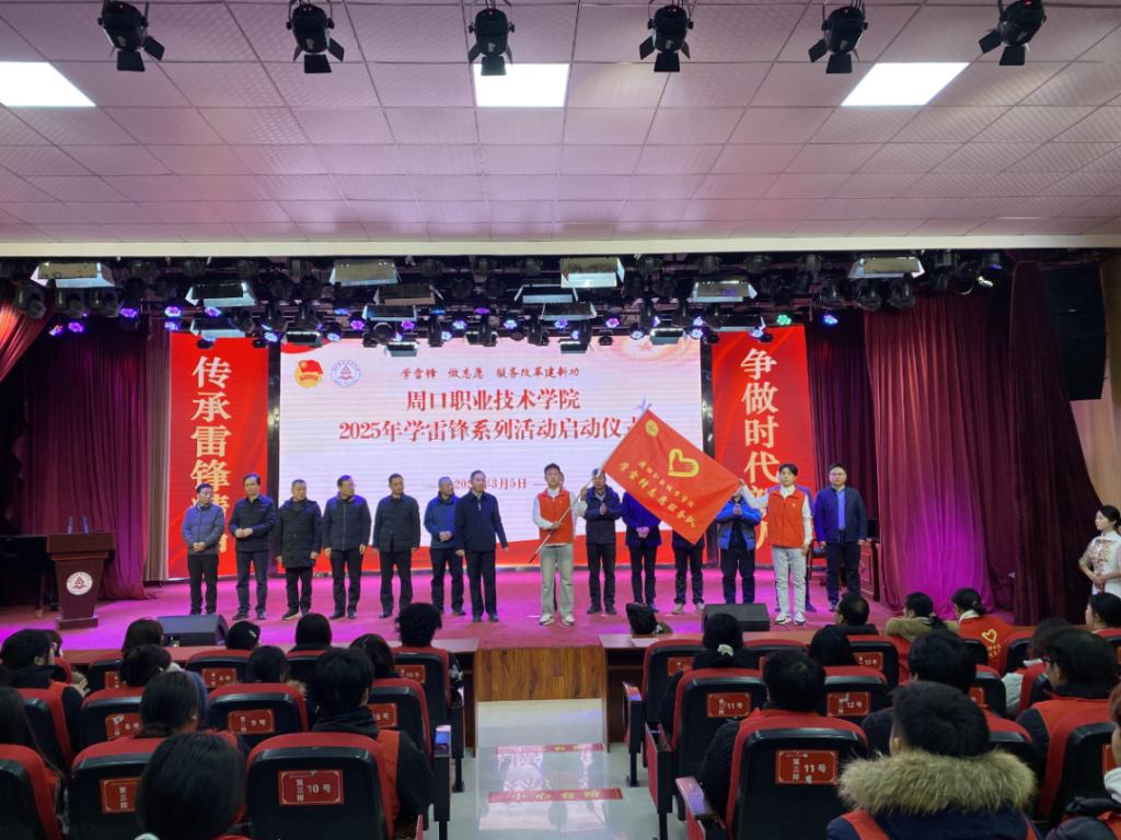 在授旗仪式环节,校党委副书记郭汝礼为校青年志愿者授旗,鲜红的旗帜象征着责任与使命,也预示着周口职业技术学院2025年学雷锋系列活动正式拉开帷幕。