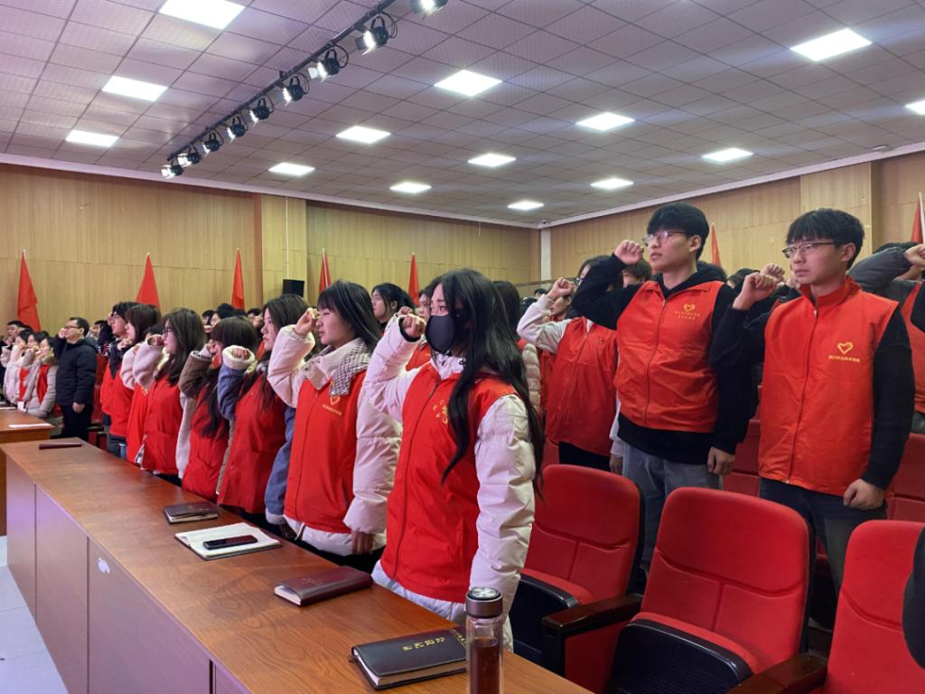 在领誓人郭启航同学的带领下,在场全体青年志愿者举起右拳,庄严宣誓,神情专注,传递出对志愿服务的热忱与坚定,他们铿锵有力的誓言久久回荡在学艺演播厅内。