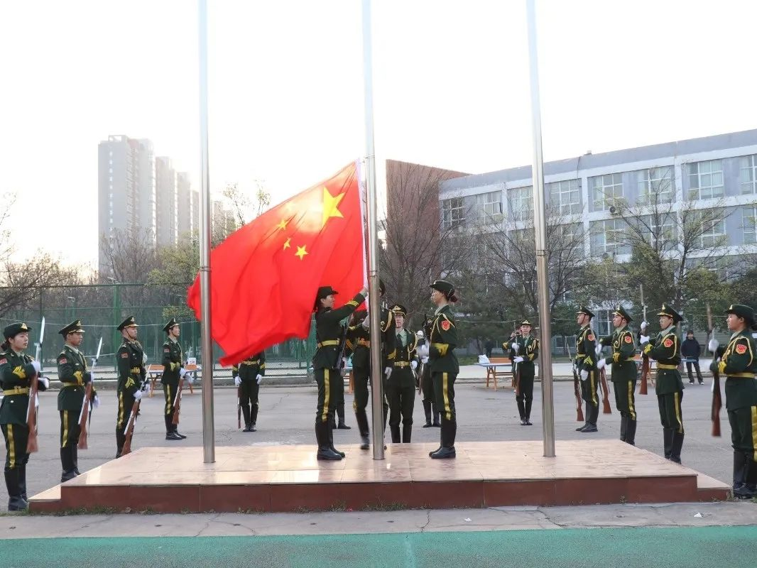伴随着庄严的国歌声,国旗护卫队迈着铿锵有力的步伐护送着国旗,气宇轩昂地走向升旗台。鲜艳的五星红旗在全院师生的注目礼中冉冉升起。