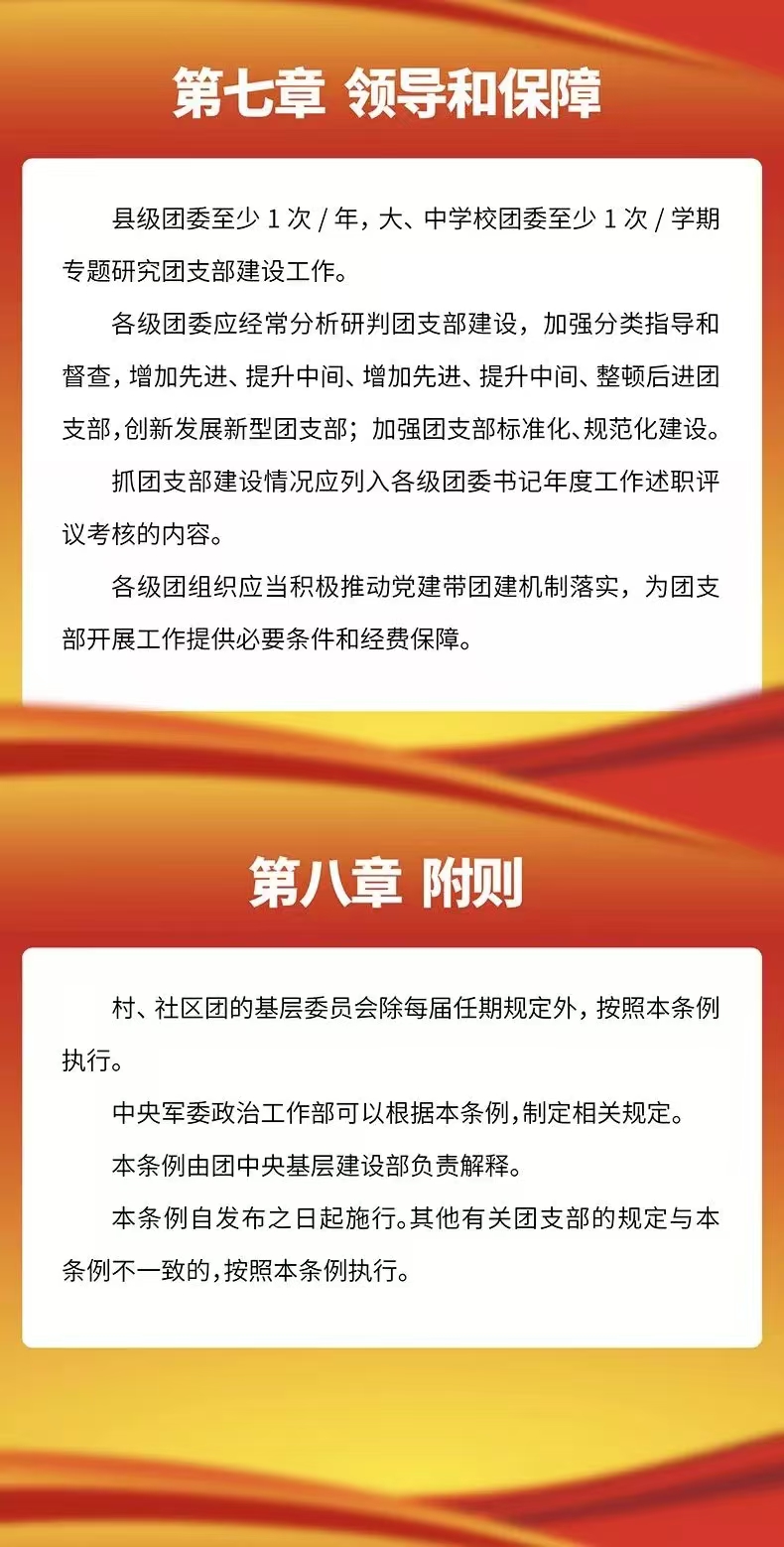 近日,共青团中央印发了《中国共产主义青年团支部工作条例(试行)》(以下简称《条例》),并发出通知,要求各级团组织认真遵照执行。《条例》深入学习贯彻落实习近平新时代中国特色社会主义思想,特别是习近平总书记关于青年工作的重要思想,是加强新时代团支部建设的重要制度成果,是团的历史上第一部关于团支部工作的基础主干制度,是新时代加强团支部建设的基本规范。为更好地学习掌握《条例》内容并深入领会《条例》精神,我们制作了《条例》图解,带你一起了解《中国共产主义青年团支部工作条例(试行)》。