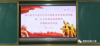 为持续推进党史学习教育走深走实,弘扬红色精神,汲取奋进力量,2022年11月16日下午2:30,经济与管理学院在4201教室召开“深入学习习近平总书记视察安阳重要讲话精神,大力弘扬红旗渠精神”专题组织生活会会议。周口职业技术学院党委副书记赵振然,经济与管理学院党总支书记陈鹏、院长袁向华及经管全体党员通过线上、线下的方式参加了本次会议。会议由陈鹏书记主持。