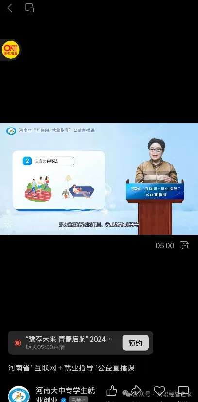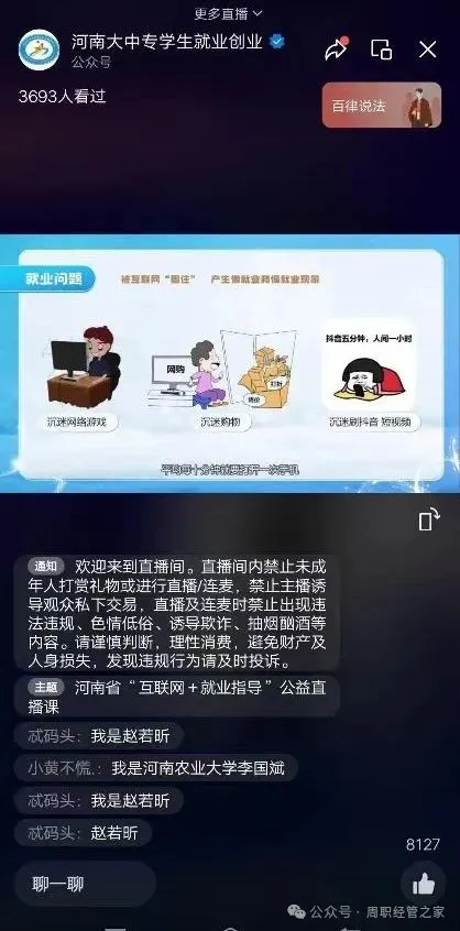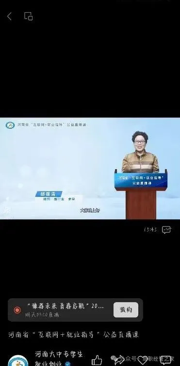 在直播开始时,郑州铁路职业技术学院的邰葆清老师,讲述了同学们沉溺于网络世界,在就业中没有明确的职业价值观,甚至可能会出现懒就业和慢就业心理,核心问题是他们不愿意面对激烈竞争的现实世界,告诉他们如何更好的解决这些问题,最后,邰葆清老师鼓励大家减少焦虑与迷茫,为顺利毕业和未来发展创造良好的心理环境。