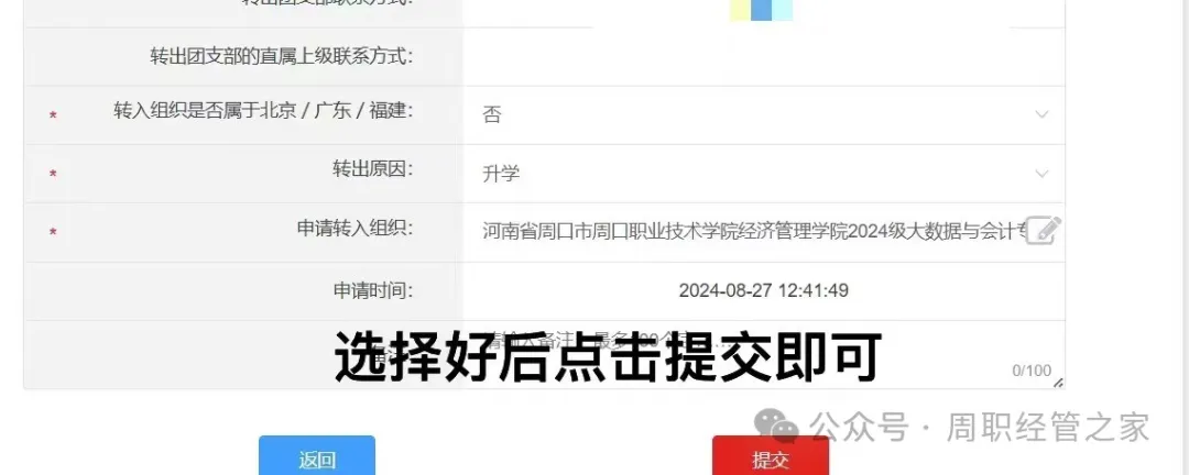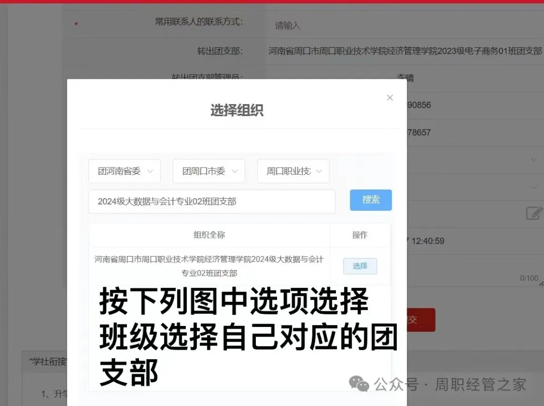 第二步:在个人中心点击:关系接转——申请转入组织——团河南省委——团周口市委——直接搜索周口职业技术学院(不要选择团川汇区委)——搜索“2024级XXX专业团支部”并转入(XXX代表被录取的专业)。