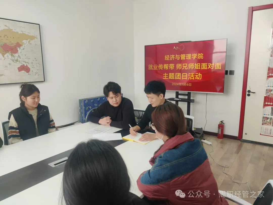 为了给同学们提供最真实、最贴近实际的就业指导,帮助同学们树立正确的就业观念,把握时代脉搏、锤炼职业技能、清晰职业规划,经济与管理学院于11月6日举行了“就业传帮带·师兄师姐面对面”主题团日活动。本次活动邀请到21级大数据与财务管理毕业生孙舰艇、卢柯铮学长来进行经验分享,部分学生代表参加。