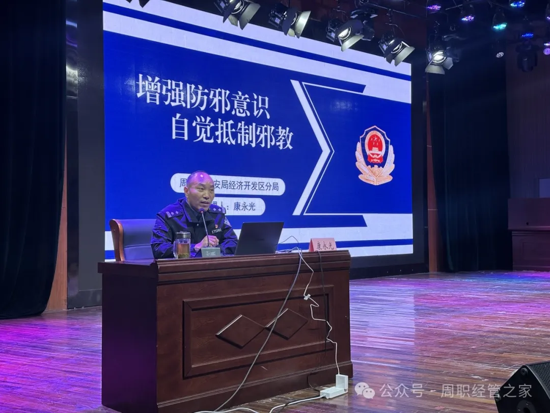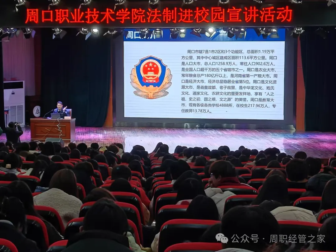 为深入推进校园法治建设,增强学生的法治观念和自我保护意识,周口职业技术学院于12月3日开展了一场以“法制进校园”为主题的宣讲讲座。此次讲座由公安局经济开发区分局代表人康警官进行法律知识的讲解与指导,经济与管理学院同学积极参加。
