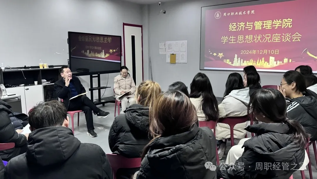 为深入践行习近平新时代中国特色社会主义思想,精准洞悉师生思想动态,全方位关怀师生学习生活,全力助推师生队伍素质进阶,经济与管理学院于12月10日举行学生思想状况座谈会。党总支书记陈鹏和学管办主任杨璐璐与学生围坐畅聊,座谈会现场气氛热烈。