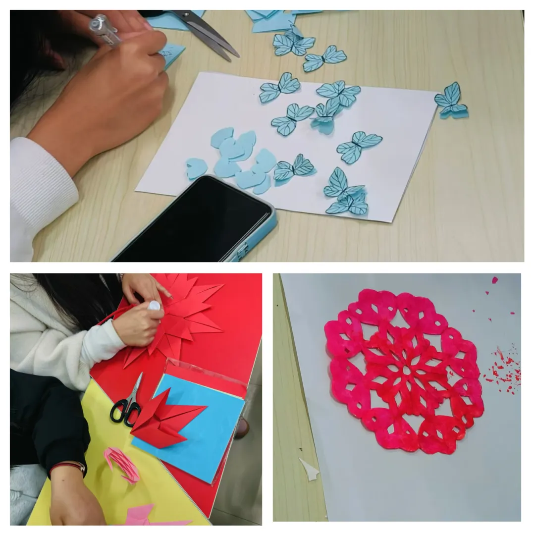 随后,同学们用巧手为纸张赋予生命,折纸作品形态各异,或为灵动的千纸鹤,或为精巧的花朵。剪纸作品更是美轮美奂,精细的图案在剪刀下诞生,展现出传统文化的魅力,也彰显出大家的无限创意。