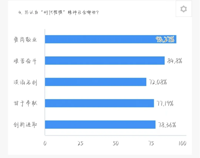在这个问题中,选择爱岗敬业的学生有93.27% ;选择艰苦奋斗的学生有 84.8% ;选择淡泊名利 的学生有72.08% ;选择甘于奉献的学生有 77.19% ;选择创新进取的学生有 78.36%。