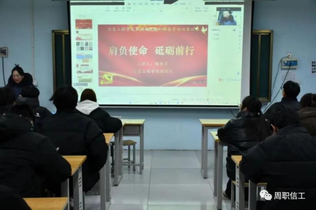 为加强对入党知识分子的培训工作,深化党的基本理论、基本路线、基本纲领和基本经验教育进一步提高入党积极分子的党的基础理论素养,信息工程学院于12月27日在6121、6143教室同时进行,本次党课由副院长侯艳芳为入党积极分子们讲党课——“肩负使命,砥砺前行”。