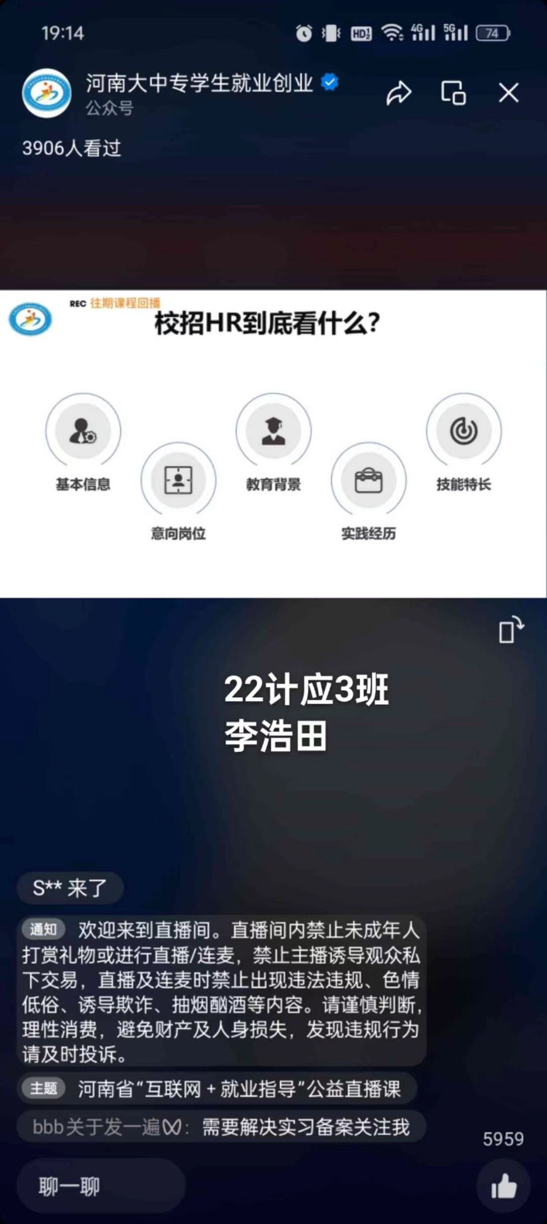 简历将会成为获得企业录用的一把“金钥匙”;而良好的面试形象展示,更会帮助学生在面试环节脱颖而出,形象礼仪内外兼修,将助力求职者更快适应职场环境,获得更好职业发展,为了更好的帮助我院学生在求职过程中拥有一份内容详实、风格独特的简历。周口职业技术学院信息工程学院全体学生于6月4日晚上19:00进行观看“互联网+就业指导”公益直播课。