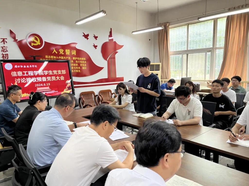 根据党员发展工作计划,并经上级党组织预审同意,2024年6月19日下午,在学院党员活动室6140,信息工程学院召开党总支大会,全体党员同志参加了会议,讨论接收党员发展对象赵嘉逸、郭艺博等21名同学为学生预备党员事宜,会议由学生支部书记楚书来主持。