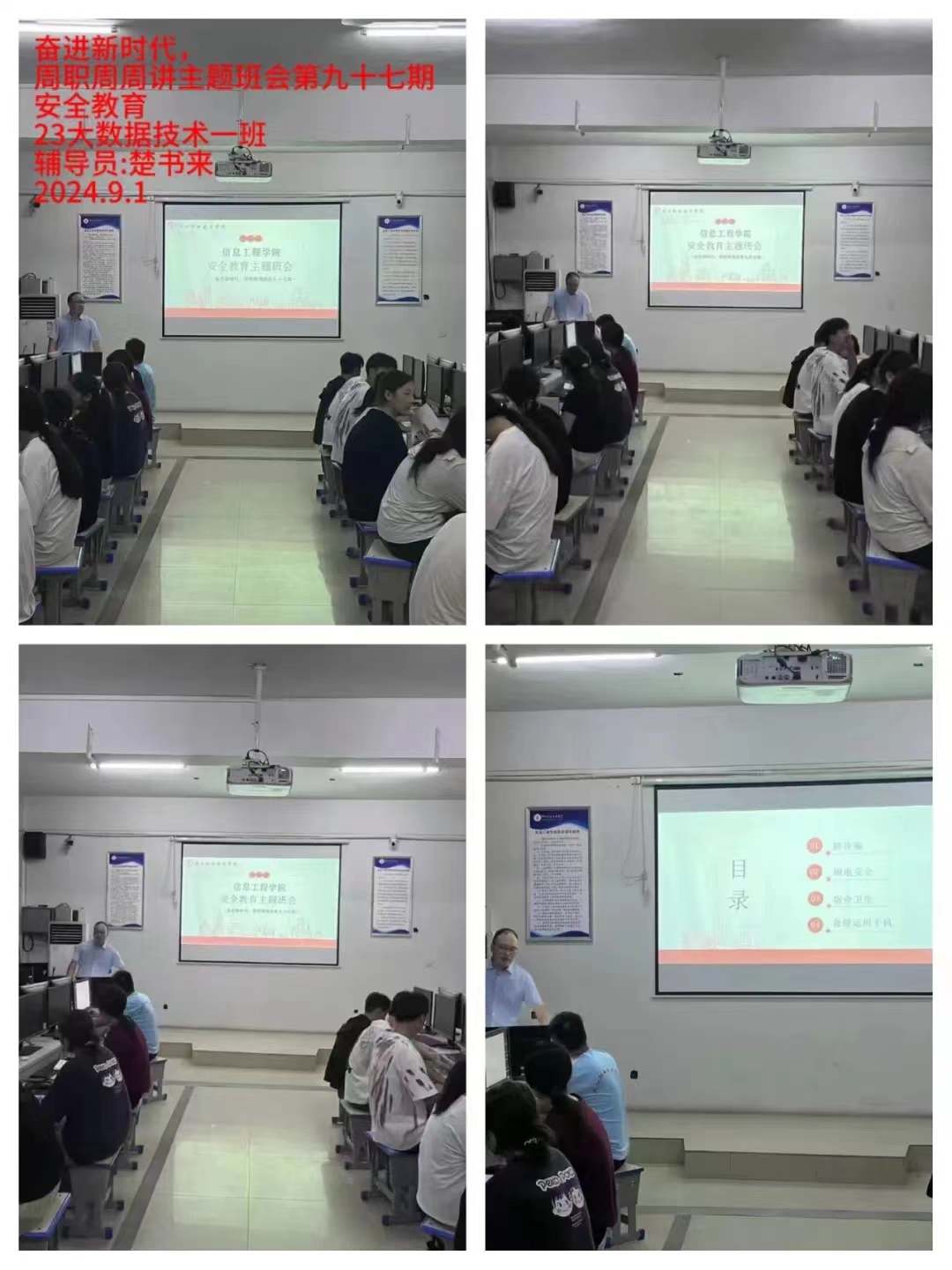 为迎接新学期,信息工程学院于91日举办了“奋进新时代、周职周周讲”系列主题班会的第九十七期——“安全教育”。此次班会旨在提升学生的安全意识,增强自我保护能力,从而保障人身和财产安全,共同营造和谐安全的校园环境。