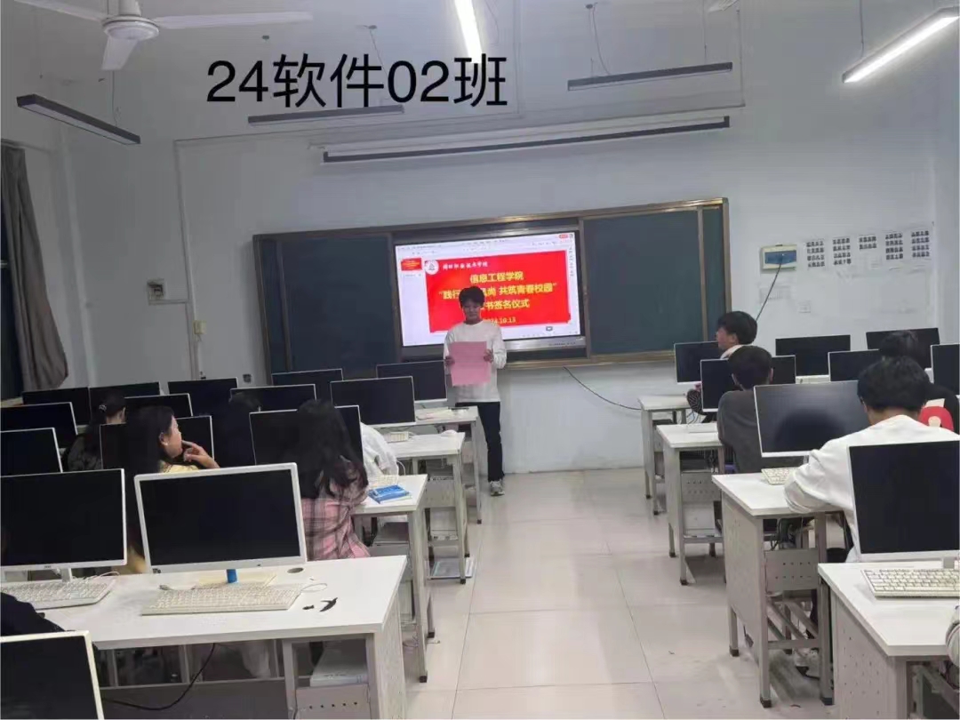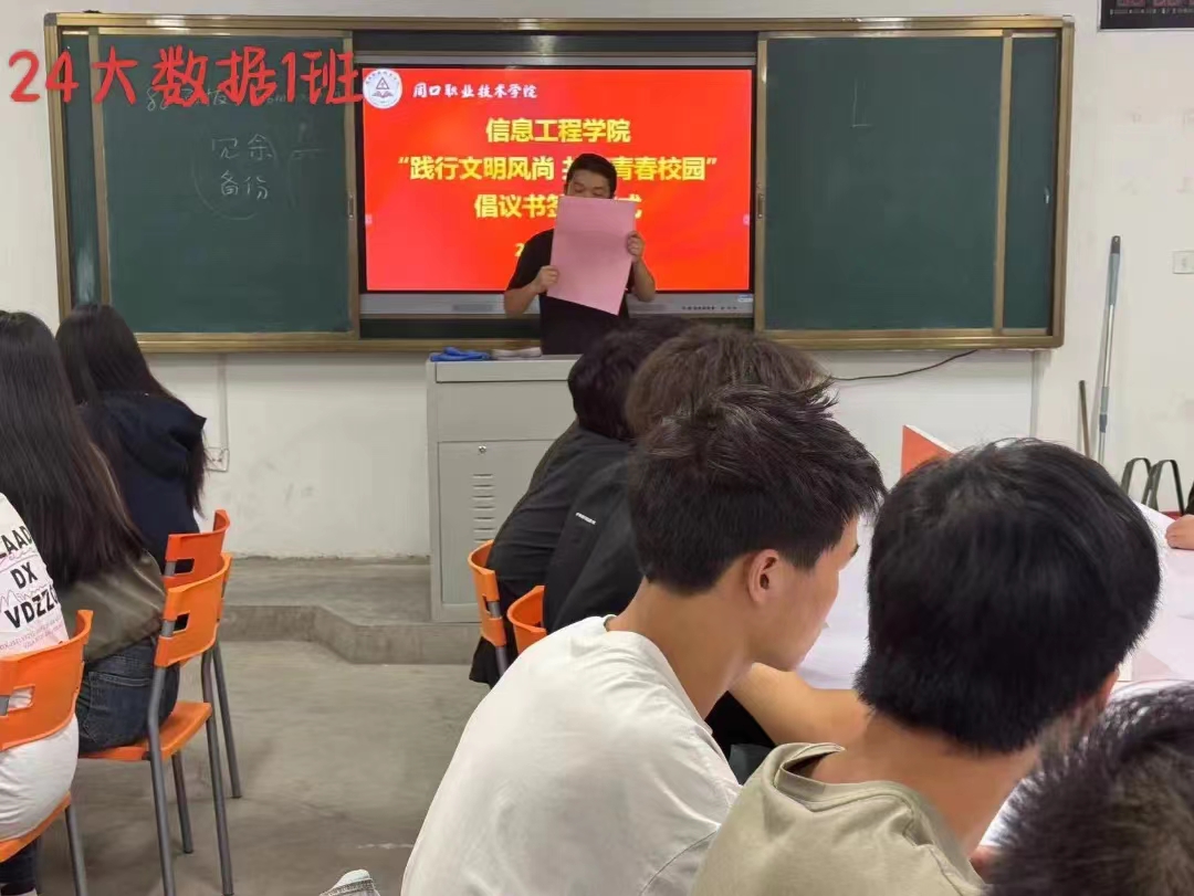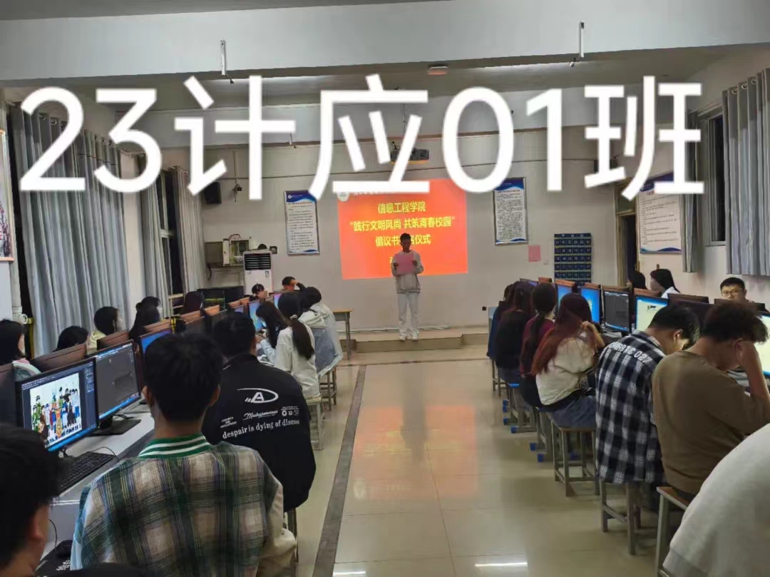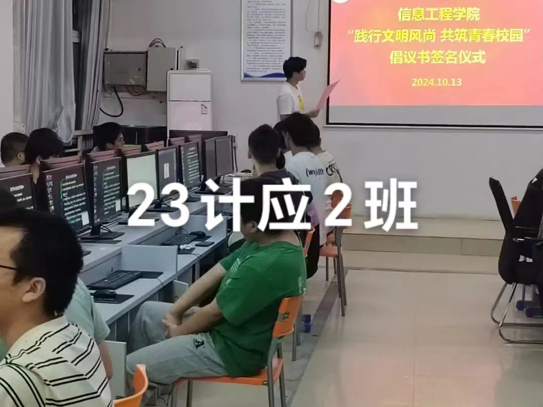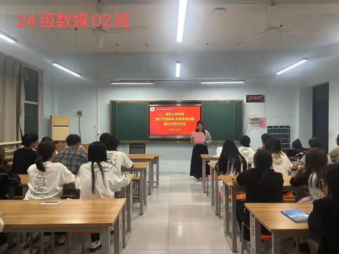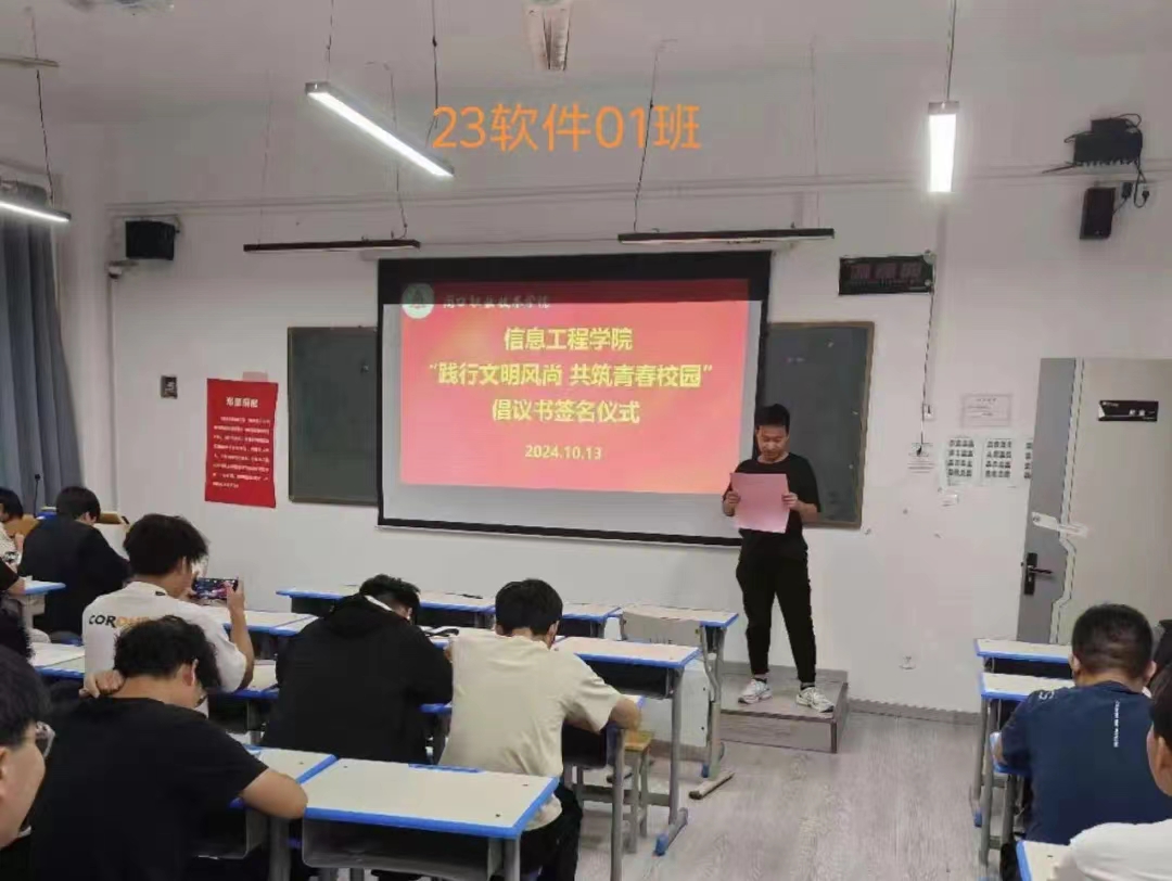 严以修身,慎独自律,为进一步促进同学们自觉践行文明礼仪,提高自身文明礼仪修养,积极营造优良育人系风、校风。1013日,信息工程学院在各班级内举办了“践行文明风尚 共筑青春校园”倡议书签名仪式。仪式上,各班代表宣读了倡议书,号召全体同学从自身做起,从小事做起,争做文明风尚的传播者和实践者。