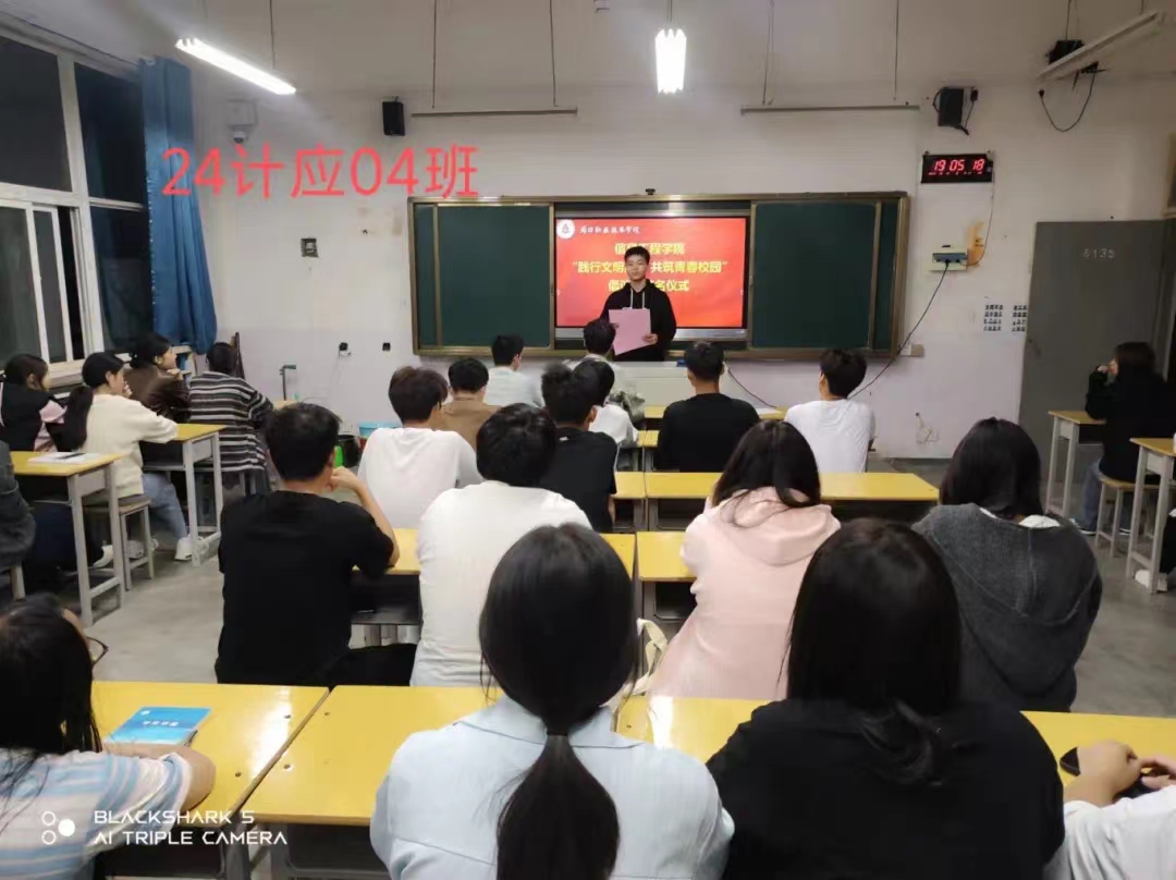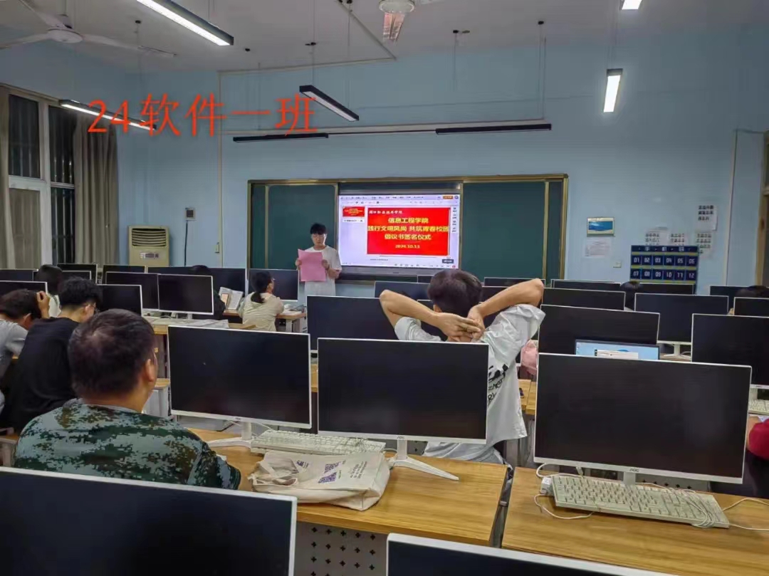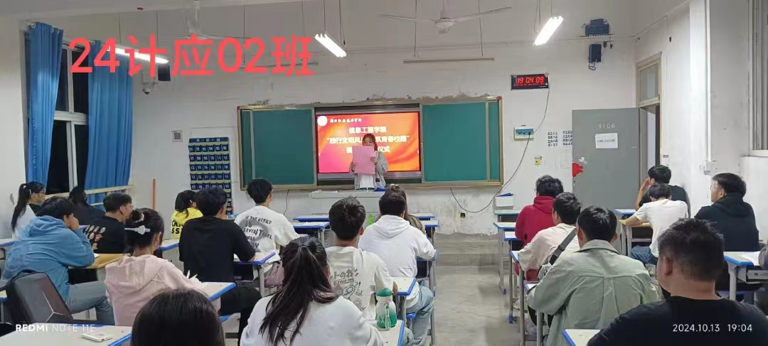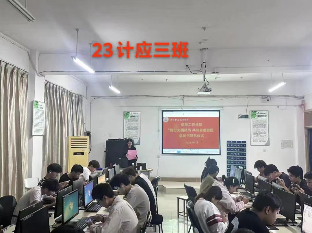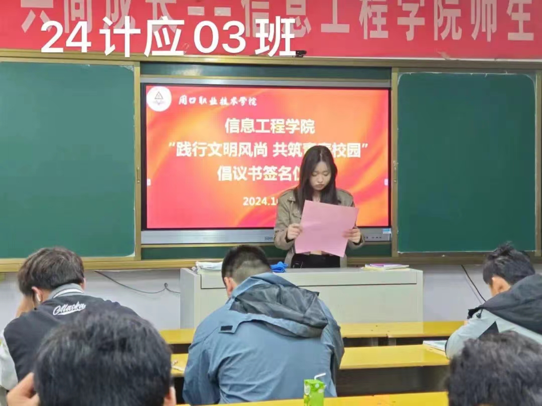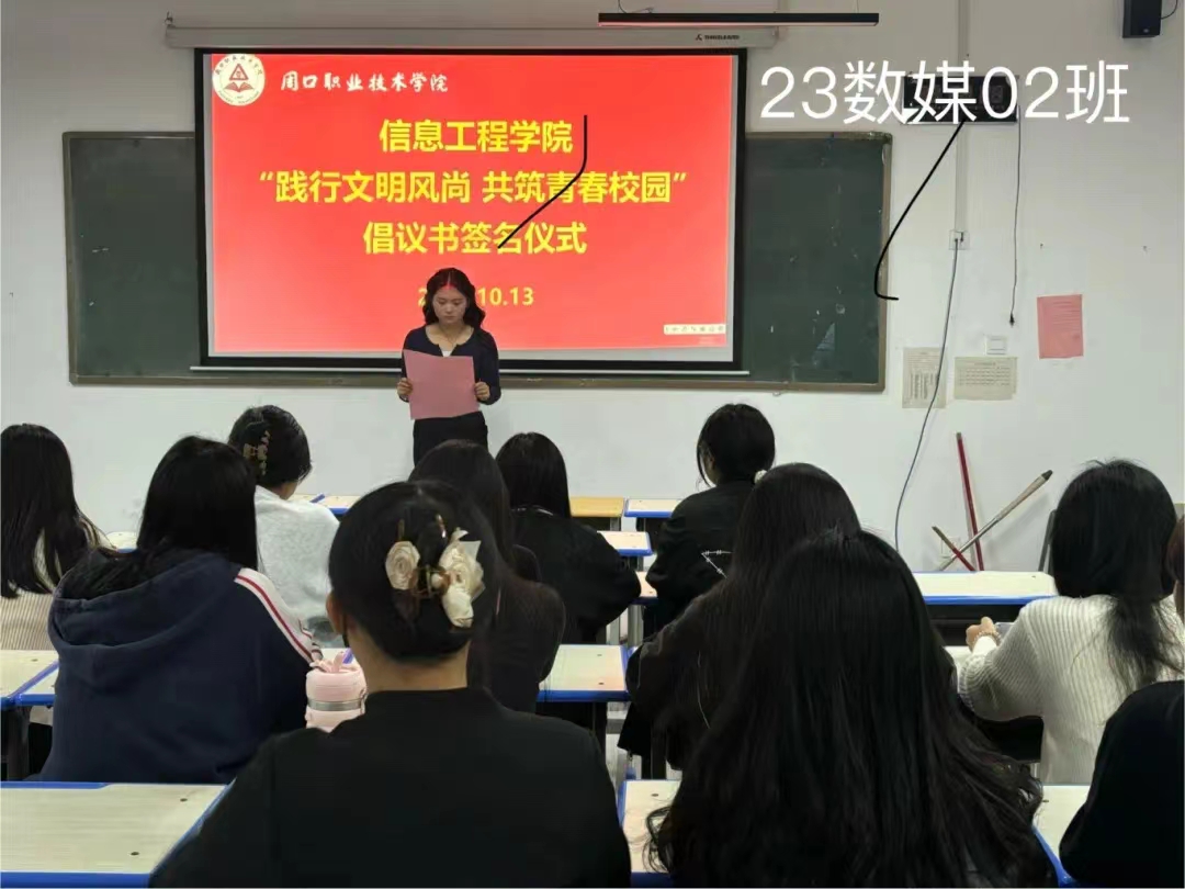 严以修身,慎独自律,为进一步促进同学们自觉践行文明礼仪,提高自身文明礼仪修养,积极营造优良育人系风、校风。1013日,信息工程学院在各班级内举办了“践行文明风尚 共筑青春校园”倡议书签名仪式。仪式上,各班代表宣读了倡议书,号召全体同学从自身做起,从小事做起,争做文明风尚的传播者和实践者。