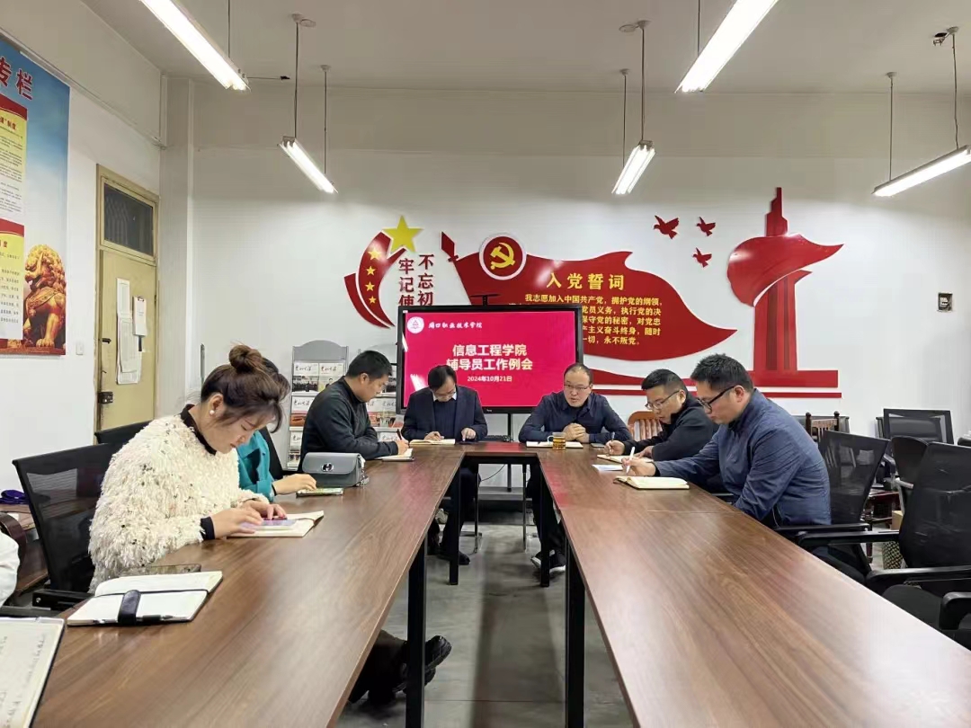 10月21日中午,在学院办公室6140,信息工程学院召开辅导员工作例会。党总支书记宋良鹤,副院长楚书来,学管办主任张矿伟及23、24级辅导员参加了本次会议,会议由楚书来主持。