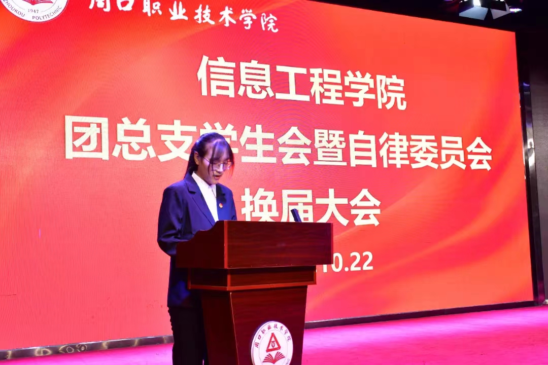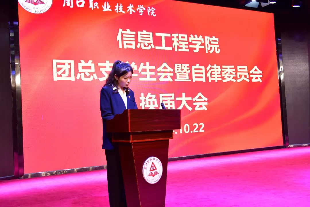 在金秋十月的美好时节,信息工程学院为了加强基础管理,营造良好的学院氛围,团总支学生会暨自律委员会迎来了换届。此次换届不仅有助于学院的学风建设,还能让学生干部们更好地服务于同学,服务于学院,同时也是提升学生干部服务能力、增强其工作能力的一个重要契机。10月22日中午,信息工程学院在学艺演播厅隆重举行了第二十一届团总支学生会换届大会,出席本次大会的有信息工程学院党支部书记宋良鹤、院长黄宇达、学管副院长楚书来、学管办主任张矿伟及各班辅导员、第二十一届团总支学生会全体成员、23级、24级班长团支书。