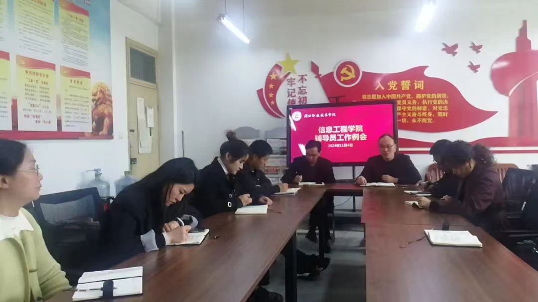 11月4日中午,在学院办公室6140,信息工程学院召开辅导员工作例会。党总支书记宋良鹤,副院长楚书来,学管办主任张矿伟及23、24级辅导员参加了本次会议,会议由楚书来主持。