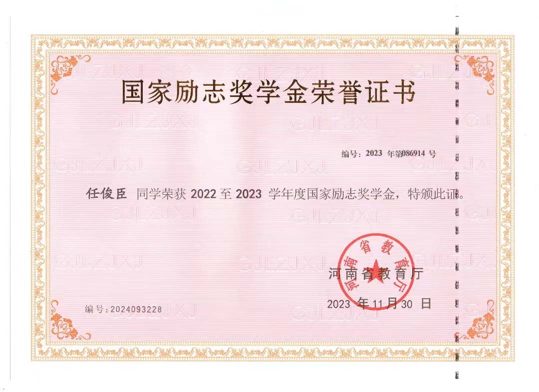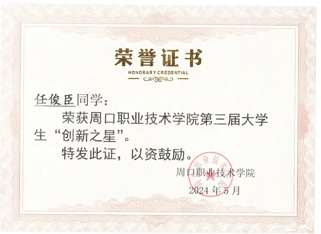 任俊臣,男,汉族,出生于2003年12月18日,预备党员,2022年9月入学,就读周口职业技术学院,信息工程学院计算机网络技术02班。曾获荣誉:第三届河南省大学生“创新之星”、2023国家励志奖学金、第七届普通高等学校“出彩中原”大学生社会实践活动项目获省级立项、河南第九届互联网+大学生创新创业大赛省赛一等奖、第十八届“振兴杯”全国青年职业技能大赛创新创效竞赛省赛金等奖、第十八届“振兴杯”全国青年职业技能大赛创新创效竞赛国赛金奖、第十八届“挑战杯”全国大学生课外学术科技作品竞赛“黑科技”展示活动恒星级作品(等同于全国一等奖)、第十八届全国高职院校“发明杯”大学生专利创新大赛国赛二等奖、第十届全国青年科普创新实验暨作品大赛三等奖等。