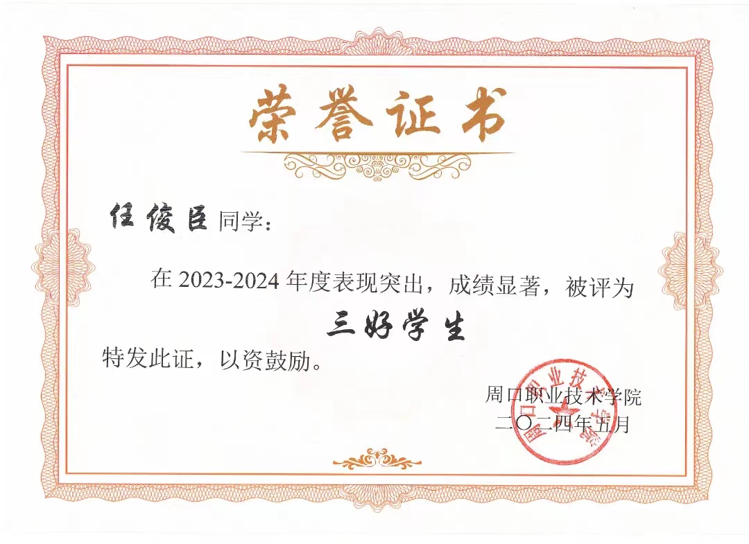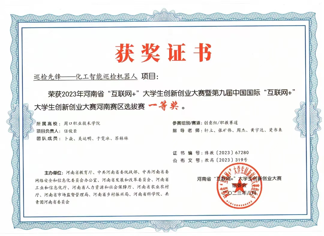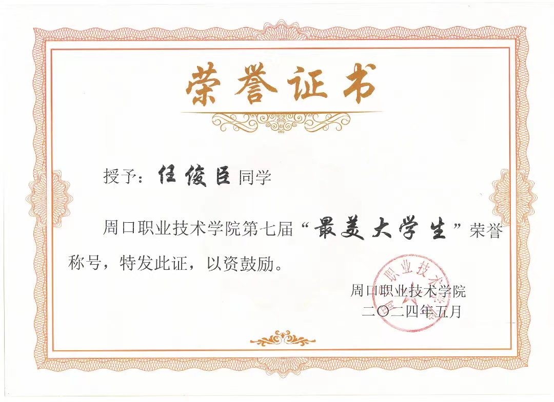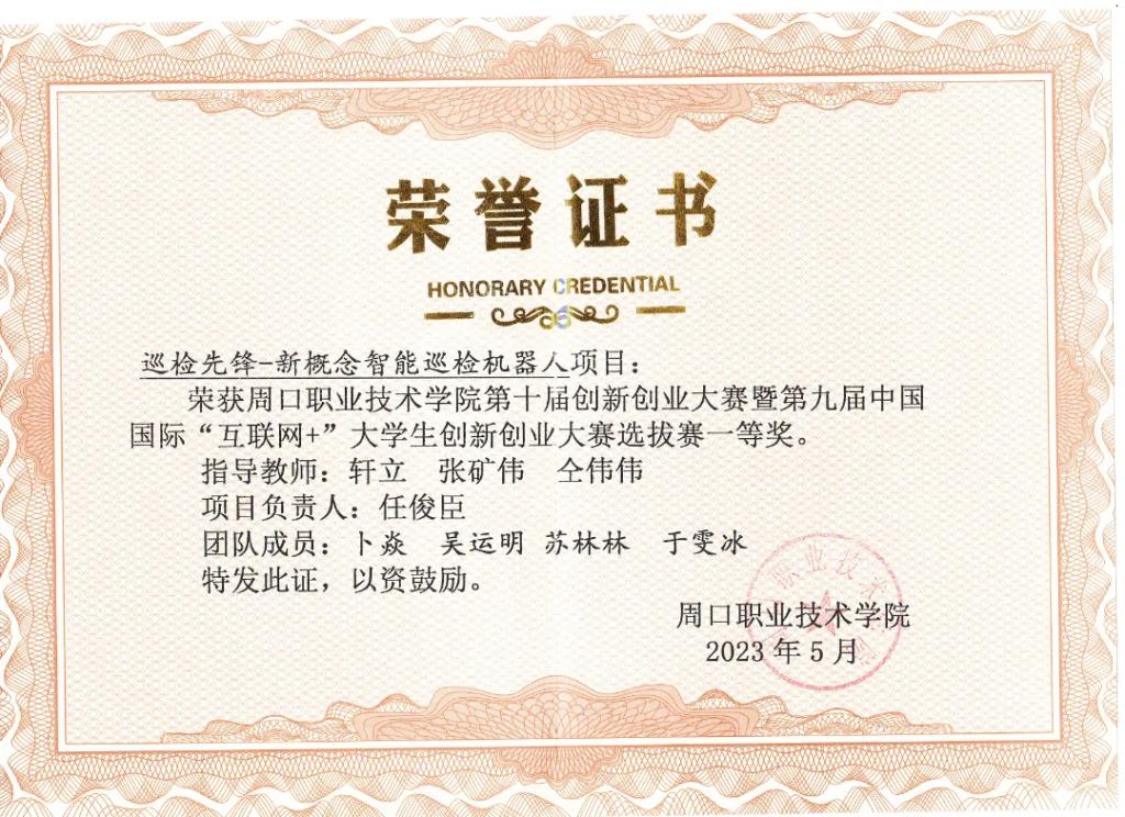 奉献自该生,率先垂范 于时代的旋律中聆听,创新是奏响辉煌乐章的最强音;于时代的浪潮中探寻,创业是激起澎湃浪花的无穷力量。作为一名新时代的有为青年,该生深知创新是发展的核心动力,唯有创新方能引领未来。青年兴则国家兴,当代青年应当深入挖掘自身的创新意识与创新能力,勇当国家未来发展的中流砥柱。在 2023 年,该生踊跃报名参加周口职业技术学院第十届互联网+大学生创新创业大赛,在团队的齐心协力下,成功斩获第十届互联网+大学生创新创业大赛校赛一等奖,随后被学校推选至“互联网+”省赛,在留校培训期间,该生带领AI智慧未来创新团队日夜拼搏,努力完善每一处细节问题,并成功取得河南省互联网+大学生创新创业大赛一等奖。然而,该生并未止步于此,一个成功的项目是需要经过千锤百炼才得以问世的,该生深知前方依旧是路漫漫其修远兮,路途总是充满荆棘和坎坷,但要有虽千万人,吾往矣的勇气去面对挑战,坚定地朝着目标前进!接着,该生带领团队报名参加了第十八届“挑战杯”全国大学生课外学术科技作品竞赛“黑科技”展示活动,翻阅了三百多篇的文献资料,实地调研考察数十余次,经过上百次版本的更迭,最终《新概念智能化工巡检机器人》项目凭借着优异的成绩取得国赛一等奖的佳绩,据报道显示,此次河南省仅有一所专科院校取得此项殊荣。之后,在振兴杯省赛现场,该生的团队以全省前三名的优异成绩被推荐至振兴杯国赛现场,胜利的曙光已在眼前,一切都在悄然等待,紧张的氛围在空气中弥漫,最后的结果恰似那即将敲响的钟声,蓄势待发,在全国各大高职院校齐聚的舞台上,该生经过激烈的角逐,通过对评委的问题进行详尽的回答,自信、大方的展示项目,最终凭借着优异的成绩荣获国赛金奖。长路漫漫,他将上下而求索,未来的路还很长,该生将胸怀大志,奋勇前行!经过三年的学习与磨砺,全面提升了自身的综合能力,在工作中也学到了许多书本和课堂上学不到的宝贵经验。同时,该生养成了诚实守信、守时守约、做事讲原则、敢于承担责任的良好习惯,无论是为人处世还是交流表达,都有了显著进步。三年来,该生始终坚守“奉献无止境,追求不停歇”的人生格言。该生认真负责的工作态度和乐于奉献的精神,赢得了师生们的一致赞誉,并连续两年获得“三好学生”荣誉称号。