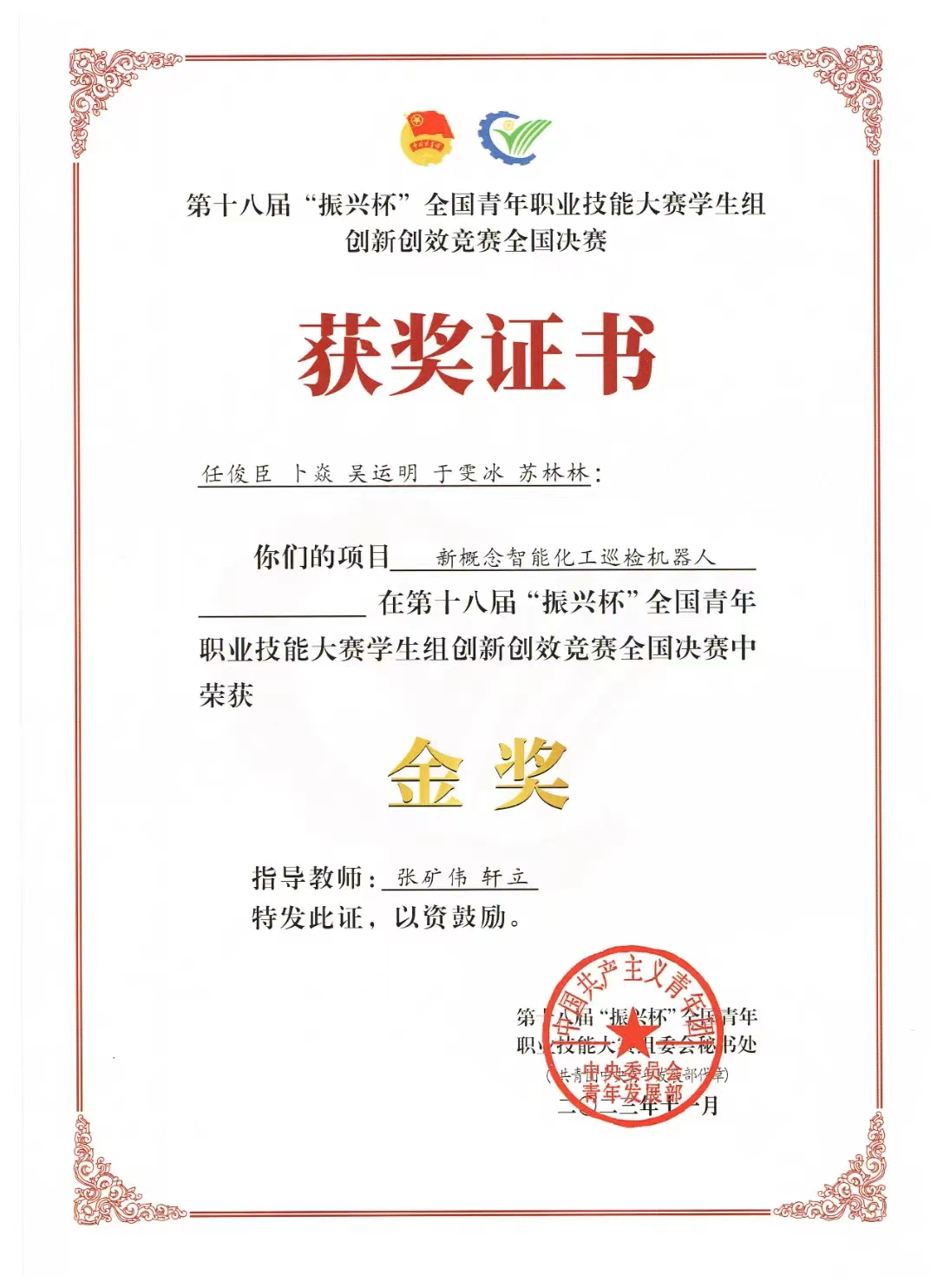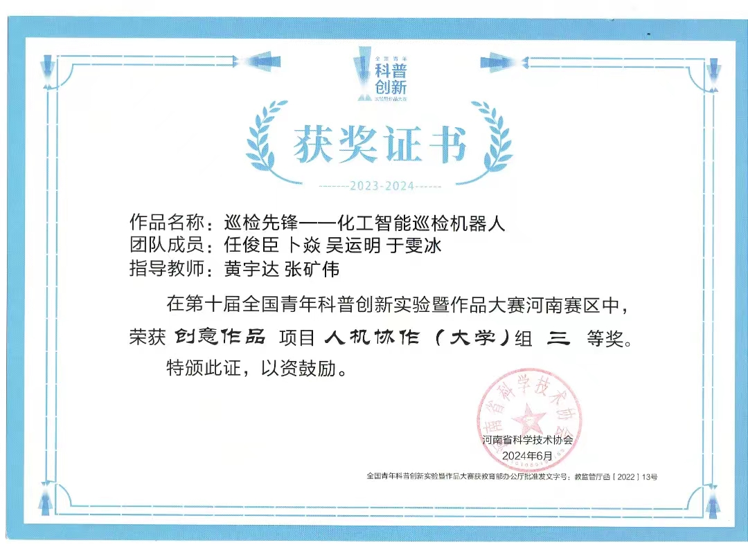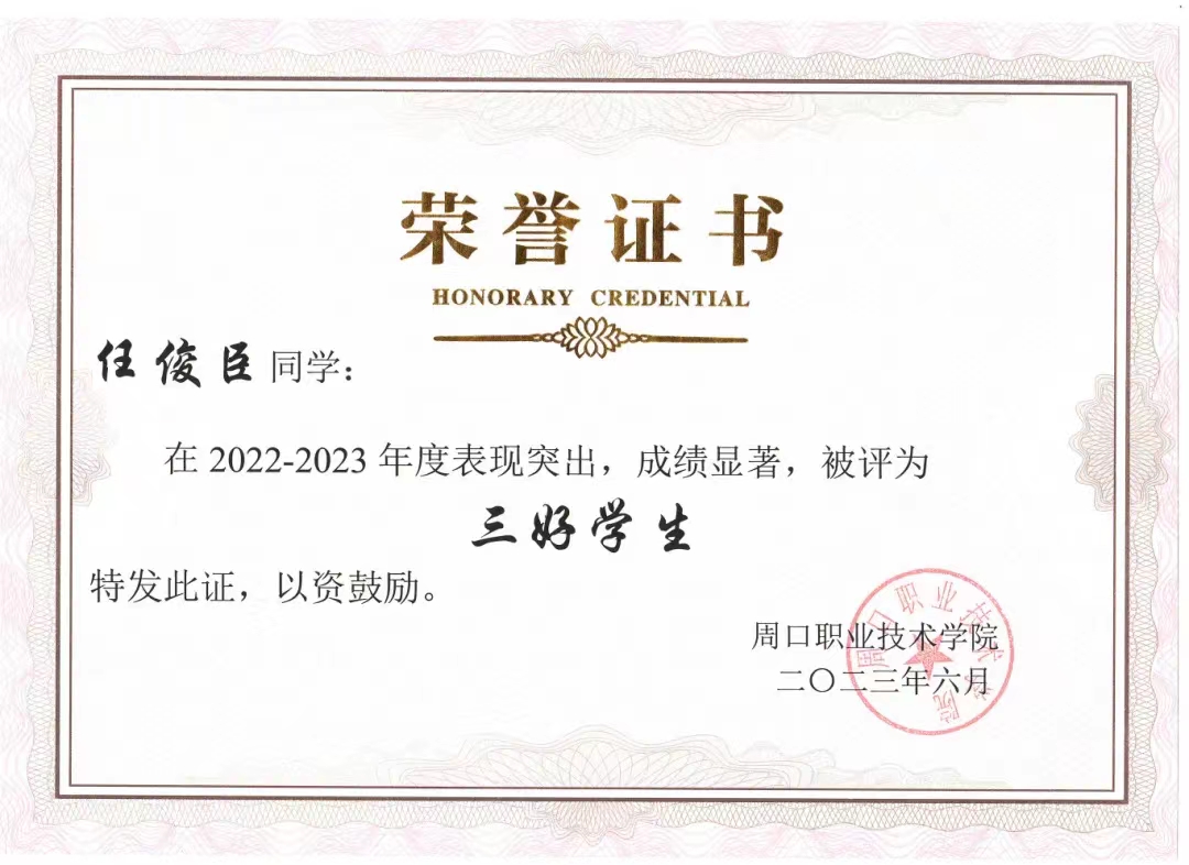 奉献自该生,率先垂范 于时代的旋律中聆听,创新是奏响辉煌乐章的最强音;于时代的浪潮中探寻,创业是激起澎湃浪花的无穷力量。作为一名新时代的有为青年,该生深知创新是发展的核心动力,唯有创新方能引领未来。青年兴则国家兴,当代青年应当深入挖掘自身的创新意识与创新能力,勇当国家未来发展的中流砥柱。在 2023 年,该生踊跃报名参加周口职业技术学院第十届互联网+大学生创新创业大赛,在团队的齐心协力下,成功斩获第十届互联网+大学生创新创业大赛校赛一等奖,随后被学校推选至“互联网+”省赛,在留校培训期间,该生带领AI智慧未来创新团队日夜拼搏,努力完善每一处细节问题,并成功取得河南省互联网+大学生创新创业大赛一等奖。然而,该生并未止步于此,一个成功的项目是需要经过千锤百炼才得以问世的,该生深知前方依旧是路漫漫其修远兮,路途总是充满荆棘和坎坷,但要有虽千万人,吾往矣的勇气去面对挑战,坚定地朝着目标前进!接着,该生带领团队报名参加了第十八届“挑战杯”全国大学生课外学术科技作品竞赛“黑科技”展示活动,翻阅了三百多篇的文献资料,实地调研考察数十余次,经过上百次版本的更迭,最终《新概念智能化工巡检机器人》项目凭借着优异的成绩取得国赛一等奖的佳绩,据报道显示,此次河南省仅有一所专科院校取得此项殊荣。之后,在振兴杯省赛现场,该生的团队以全省前三名的优异成绩被推荐至振兴杯国赛现场,胜利的曙光已在眼前,一切都在悄然等待,紧张的氛围在空气中弥漫,最后的结果恰似那即将敲响的钟声,蓄势待发,在全国各大高职院校齐聚的舞台上,该生经过激烈的角逐,通过对评委的问题进行详尽的回答,自信、大方的展示项目,最终凭借着优异的成绩荣获国赛金奖。长路漫漫,他将上下而求索,未来的路还很长,该生将胸怀大志,奋勇前行!经过三年的学习与磨砺,全面提升了自身的综合能力,在工作中也学到了许多书本和课堂上学不到的宝贵经验。同时,该生养成了诚实守信、守时守约、做事讲原则、敢于承担责任的良好习惯,无论是为人处世还是交流表达,都有了显著进步。三年来,该生始终坚守“奉献无止境,追求不停歇”的人生格言。该生认真负责的工作态度和乐于奉献的精神,赢得了师生们的一致赞誉,并连续两年获得“三好学生”荣誉称号。