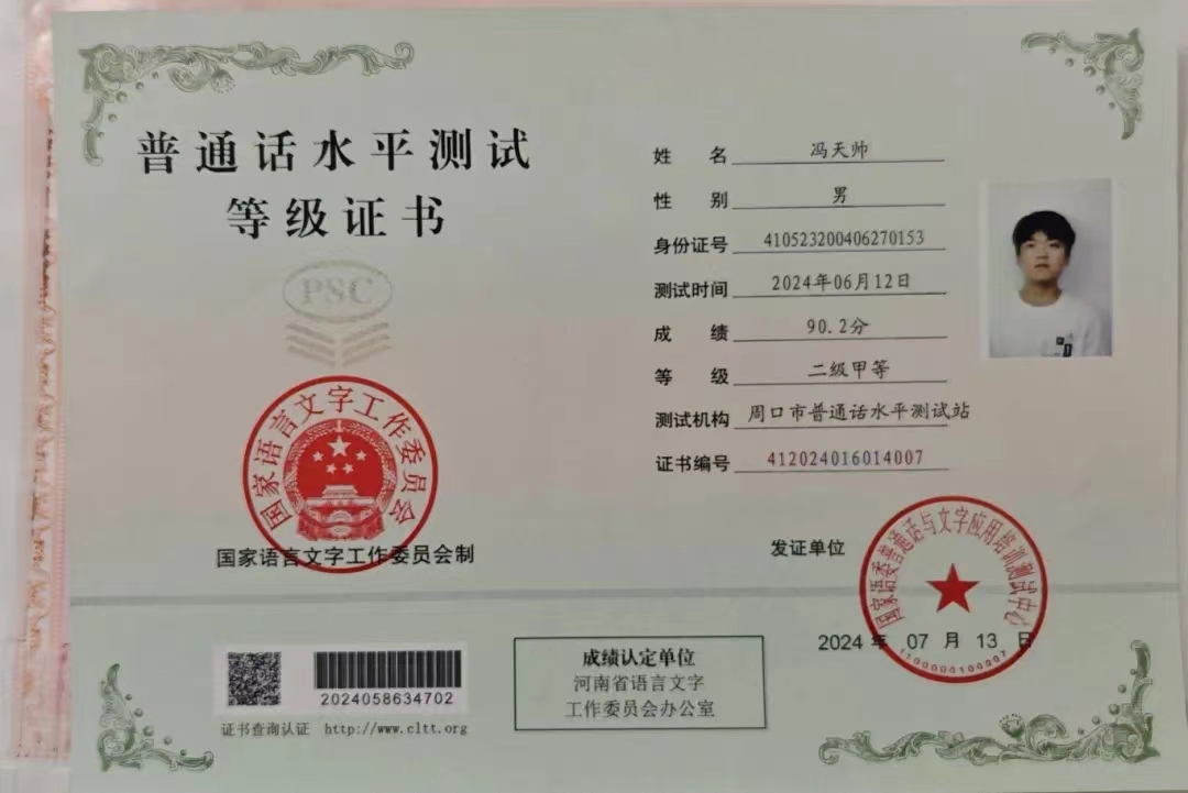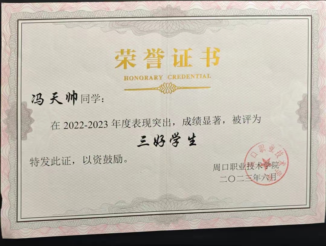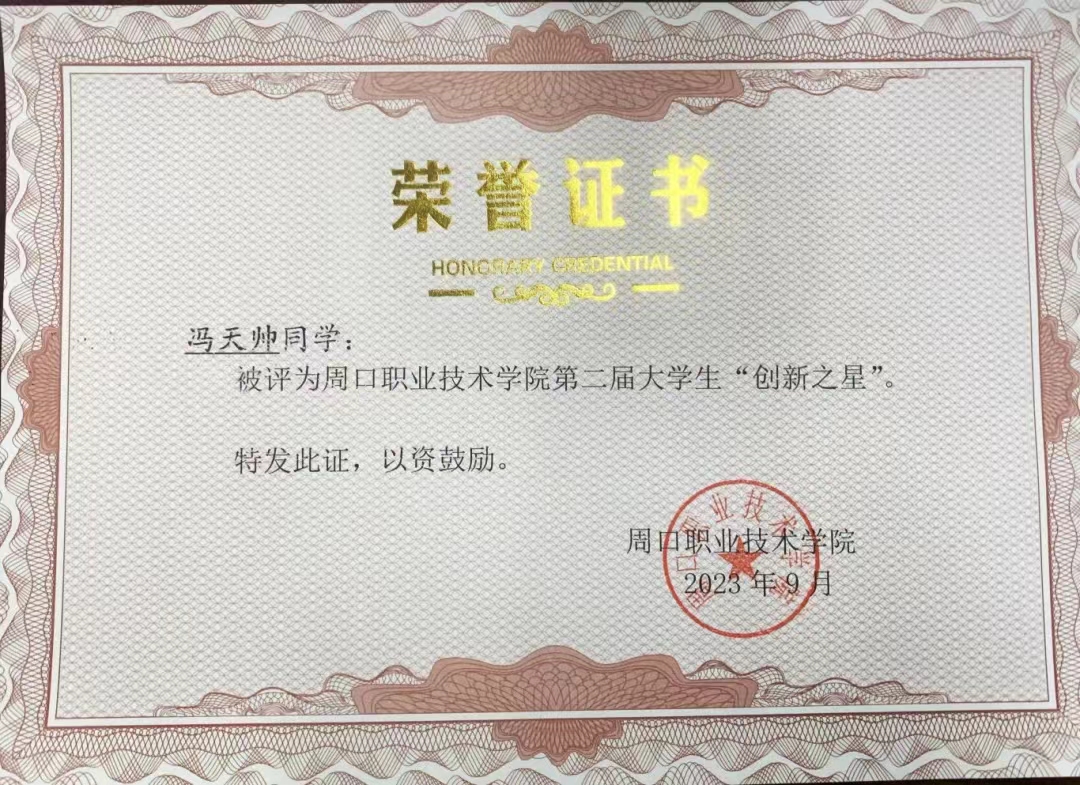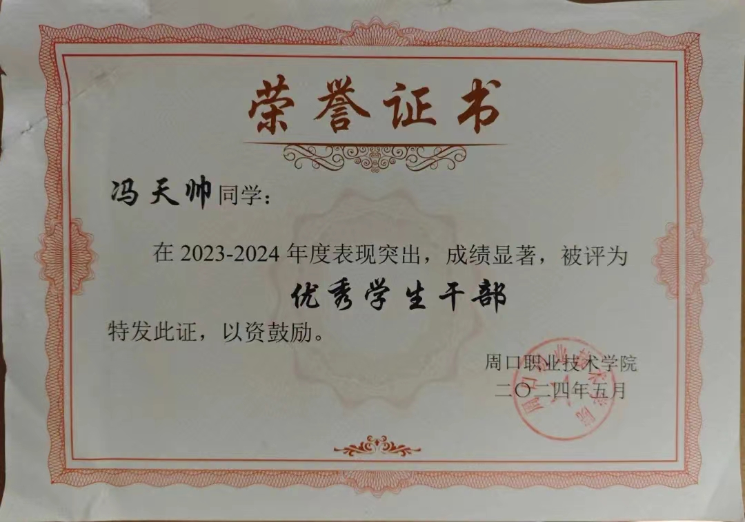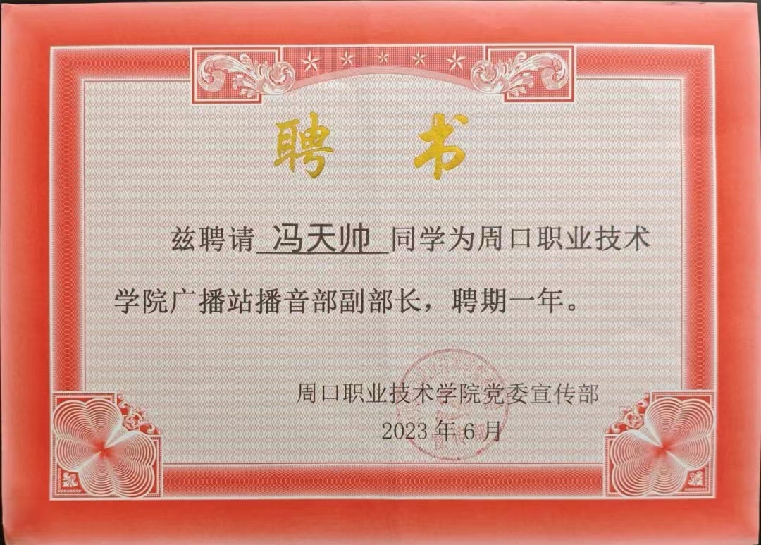 冯天帅,男,中共预备党员,周口职业技术学院信息工程学院22级计算机应用技术5班学生,在校期间担任班长、第十四届校广播站播音部负责人、第九届防艾志愿者协会会长。曾获得国家励志奖学金、校级三好学生、优秀学生干部、创新之星等称号;并参加中国国际大学生创新大赛、挑战杯获国家级三等奖、省级一等奖等十余项奖项。