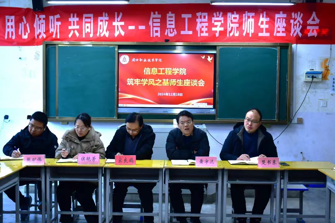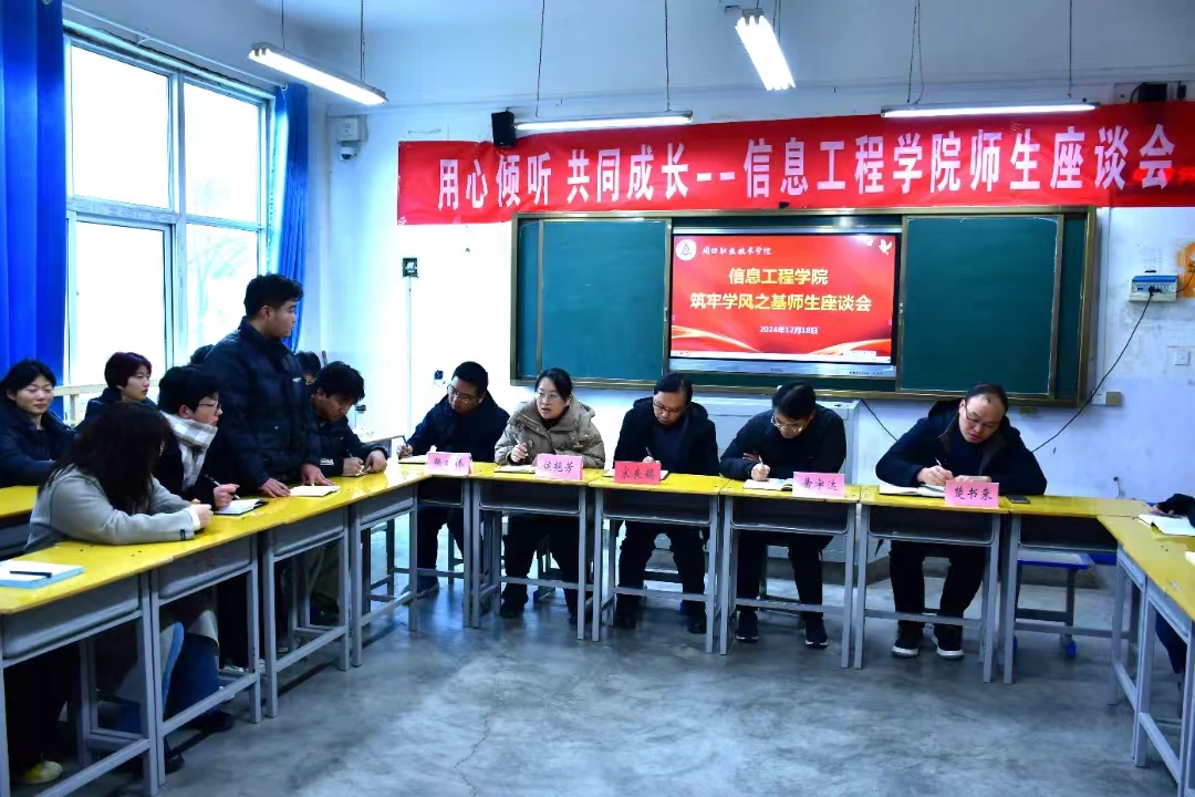 为促进优良学风建设,弘扬积极向上的学习氛围,优化育人环境,并助力学生成长成才,信息工程学院于12月18日中午在6135教室举办了“筑牢学风之基“师生座谈会。此次座谈会参加的人员包括党总支书记宋良鹤、院长黄宇达、副院长楚书来,副院长侯艳芳、学管办主任张矿伟,以及23级和24级各班级的学生代表。
