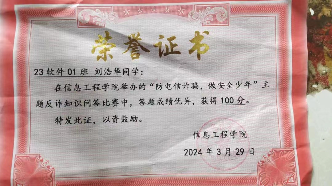 我是信息工程学院23级软件01班专业的刘浩华,此次荣获河南省2023-2024学年的国家励志奖学金,我十分激动,这是学校领导,系领导及老师对的肯定与信任。当得知自己获得国家励志奖学金的那一刻,我的内心充满了感动与感激。这份荣誉不仅仅是对我过去学习成绩的肯定,更是对我努力付出的一种认可,它让我深刻感受到了国家和学校对我们莘莘学子的关怀与期望。