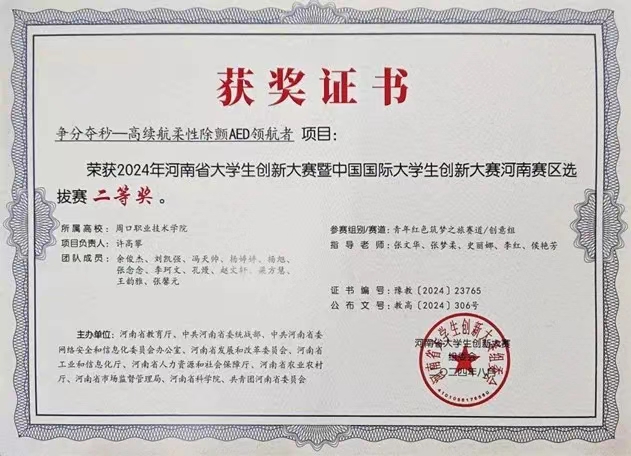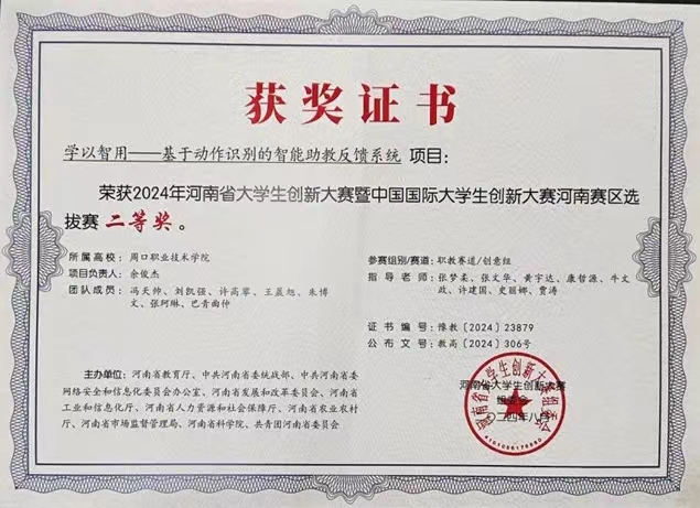 在省赛舞台上,我的其他项目亦大放异彩。“预'艾’同行一一青少年健康成长闭环式关‘艾'守护者”荣膺省赛金奖,该项目聚焦青少年防艾闭环管理体系的构建,创新提出集预防、检测、干预、关怀于一体的综合解决方案,为青少年健康成长保驾护航;“学以智用一一基于动作识别智能助教反馈系统”与“争分夺秒一一高续航柔性除颤 AED 领航者”同获省赛银奖,前者巧妙融合人工智能与教育领域,开发出精准高效的智能助教系统,有力推动教育智能化进程,后者攻克高续航柔性除颤 AED 技术难题,大幅提升急救设备性能,为挽救生命争取更多宝贵时间。在各个项目中,我充分发挥专业特长,勇挑大梁。从项目的创意构思、方案设计,到团队的组织协调、技术攻坚,再到后期的优化完善、市场推广,他皆亲力亲为、全力以赴。面对技术瓶颈与资金短缺等重重困境,他从不轻言放弃,凭借顽强毅力与创新智慧逐一化解难题。其卓越的领导才能与团队协作精神,成为项目成功的关键密钥,引领团队成员在科创征途上披荆斩棘、笃定前行。