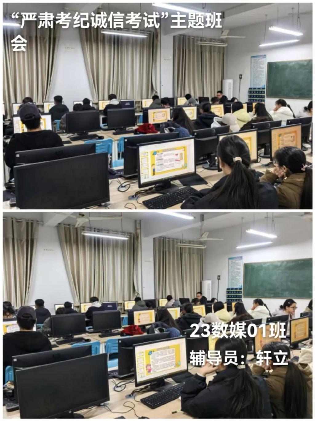 在班会上,老师们借助案例分析,深度剖析考试作弊的危害与后果,强调考试不仅是学业检测,更是道德考验。随后列举了以往考试违规案例和处理方法,以此警示同学们,引导同学们自觉遵守考试规则,筑牢诚信底线。最后,各班辅导员们鼓励同学们积极备考,合理安排学习时间,平常心对待考试,以诚实守信、积极向上的态度迎接各项考试。