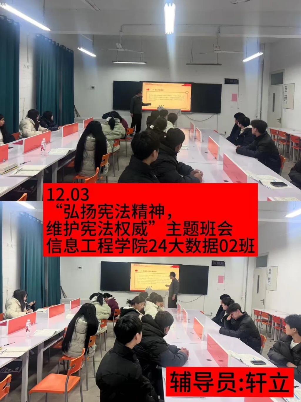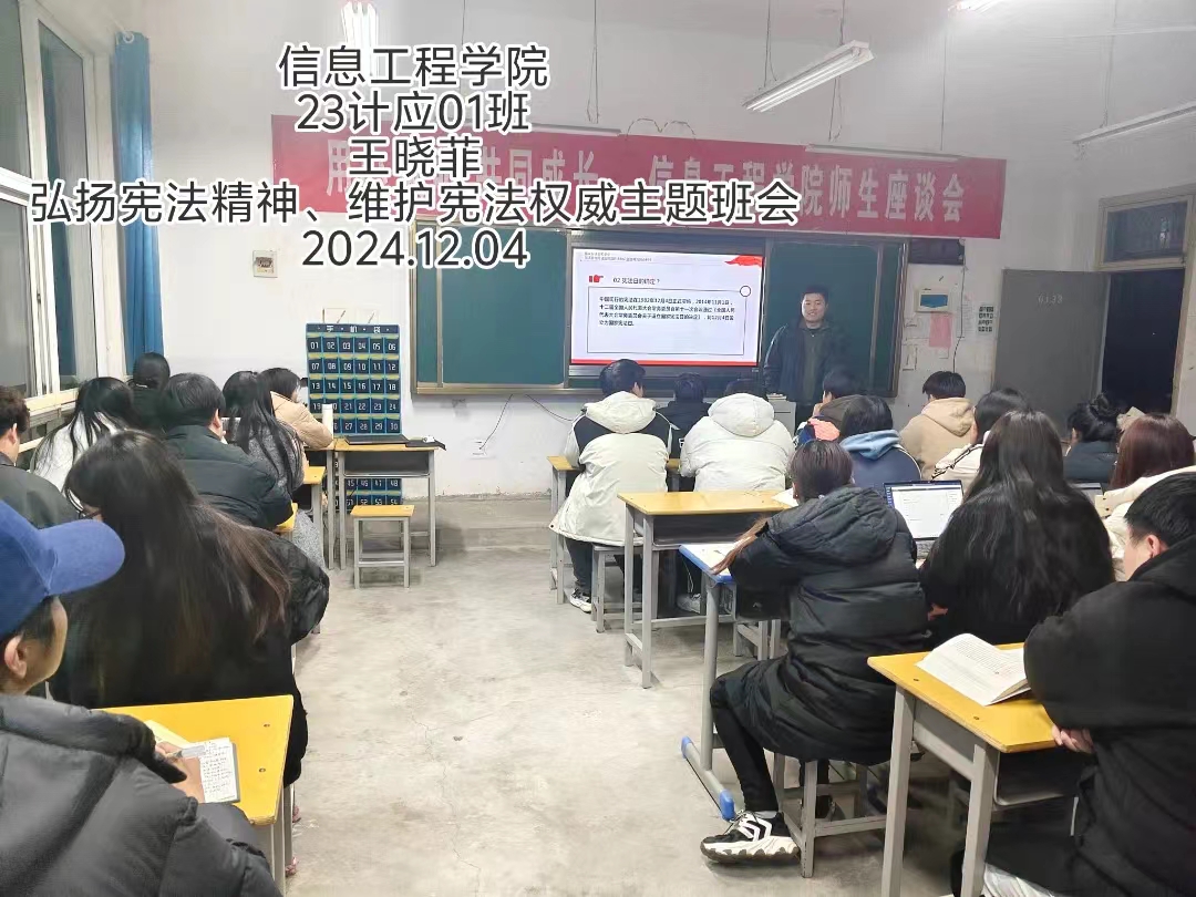 宪法作为国家的根本大法,宛如一座灯塔,指引着国家前行的方向。宪法精神体现了公平、正义与法治的核心价值,构成了社会和谐稳定的基础。为了增强同学们的法治观念,并在校内营造尊法学法、守法用法的良好氛围,信息工程学院于125日开展“弘扬宪法精神,维护宪法权威”主题班会。