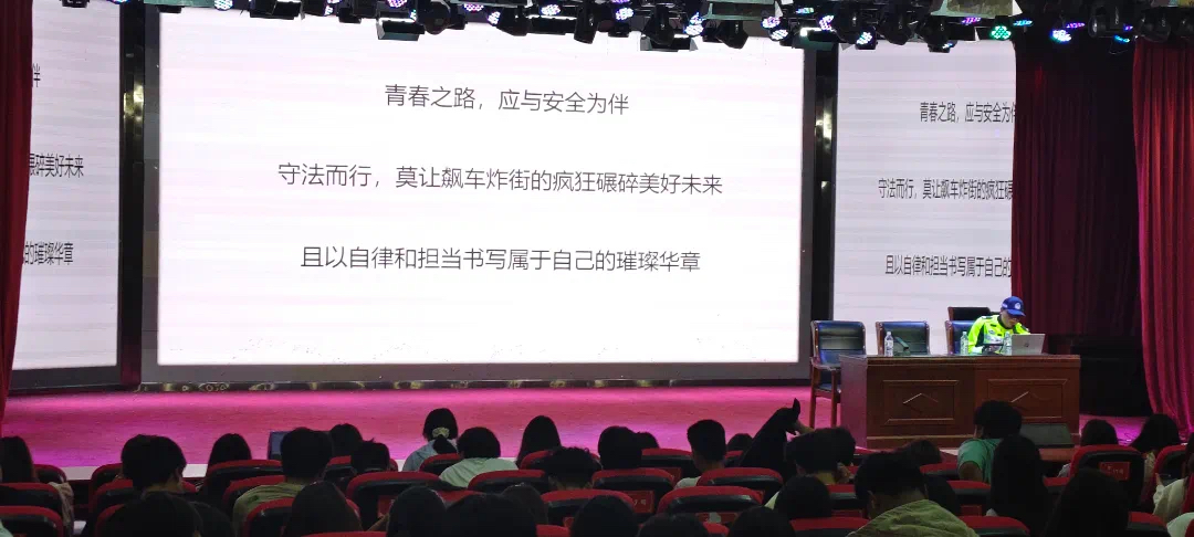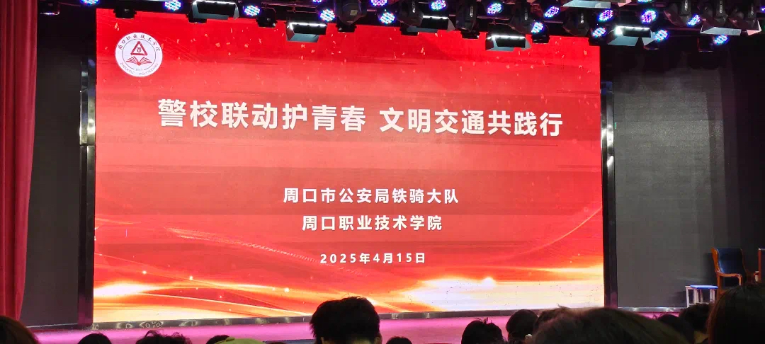 为深化校园交通安全教育,筑牢学生出行的安全防线.周口职业技术学院联和周口市公安局铁骑大队于4月15日在周口职业技术学院开元校区学艺演播厅举办了一场以“警校联动护青春,文明交通共践行”为主题的交通安全宣传活动。此次活动通过警校联动与寓教于乐相结合的方式,成功地将交通安全意识深植于每一位同学的心田。