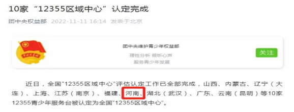 “12355”是共青团开展青少年权益服务的公益专线。河南省12355青少年服务台是共青团主办,依托专业力量、协同职能部门,直接面向青少年提供心理健康和权益维护的工作阵地,是各级团组织参与基层社会治理的有效载体。平台通过12355热线、微信公众号、小程序为全省青少年提供危机预防与救助、权益维护、心理健康、自护教育、家庭教育、困难帮扶、成长规划、素质拓展、就业创业、婚恋交友、司法保护等各种服务。