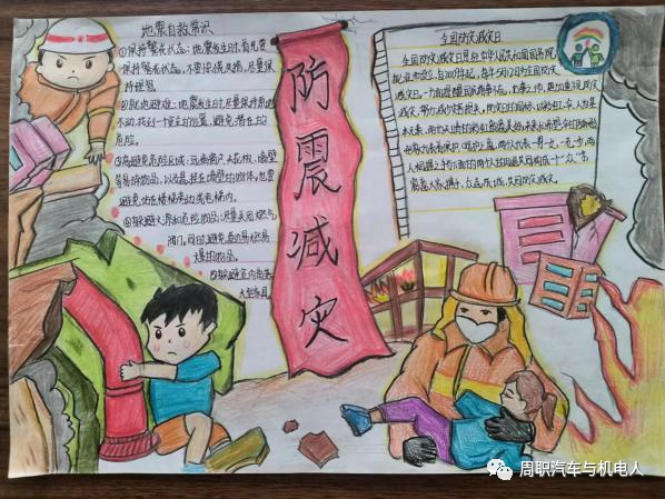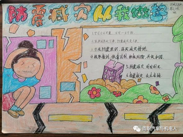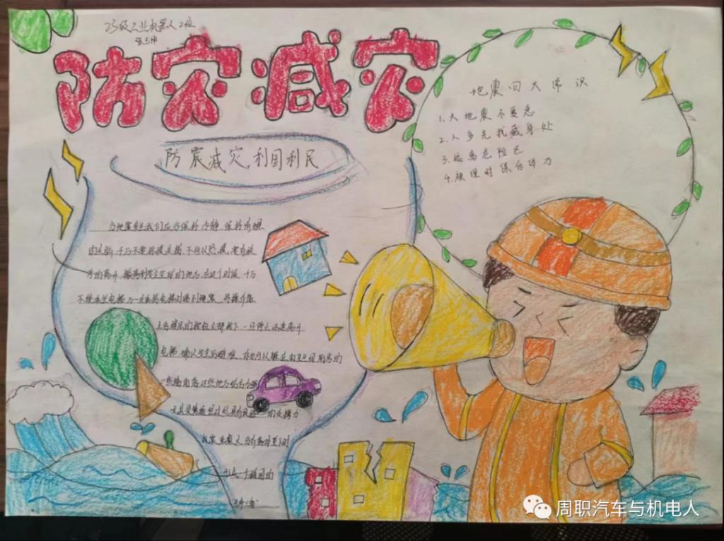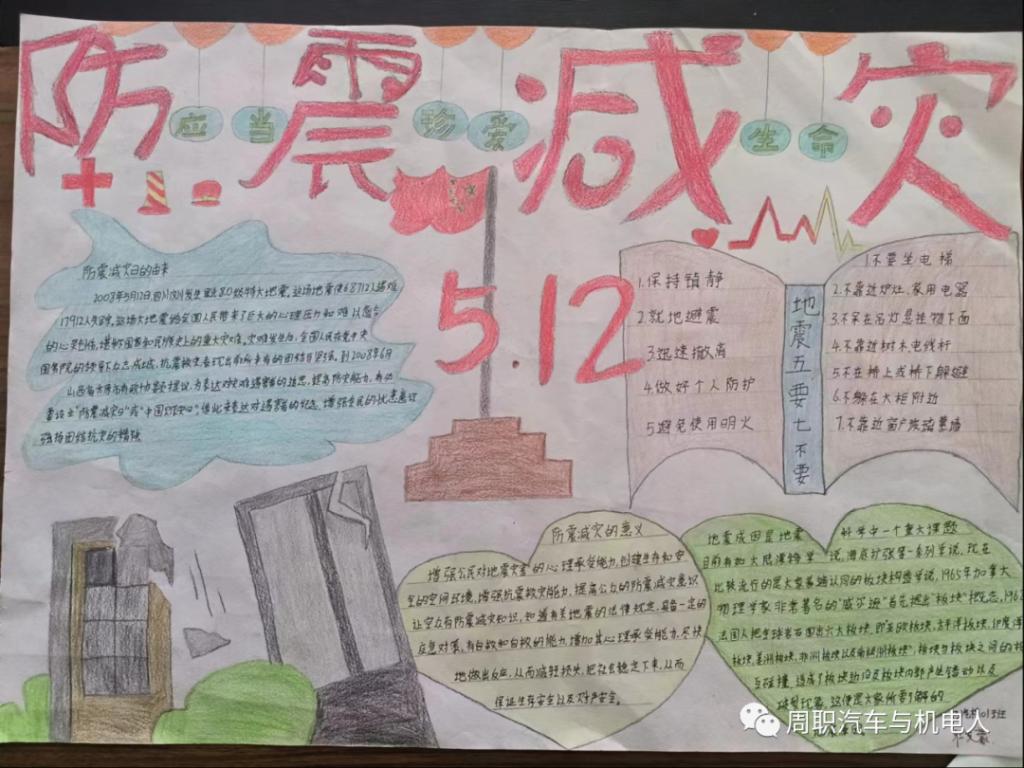 为加强防震减灾意识,增强防震减灾综合应急能力。周口职业技术学院汽车与机电工程学院于2023年10月27上午日举行以“防震减灾 珍爱生命”为主题的手抄报活动,各班积极参与。