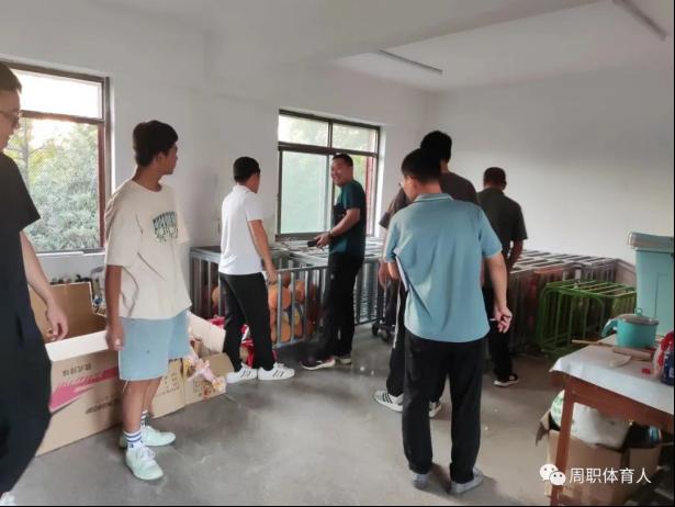 在整理过程中,21级体育教育二班c组的学生们搬、抬、扛齐上阵,虽然天气炎热,工作量巨大,大家并没有喊累,而是互相加油,默契配合。