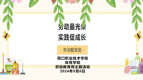 为全面贯彻党的教育方针,落实立德树人根本任务,深入学习贯彻落实省委、省政府《关于全面加强新时代大中小学劳动教育的实施意见》和《河南省教育厅办公室关于开展全省学生“劳动教育周 (月)”活动》(教体卫艺函 (2024) 238 号)文件精神,我院于5月8日举行周口职业技术学院体育学院劳动教育周主题活动。